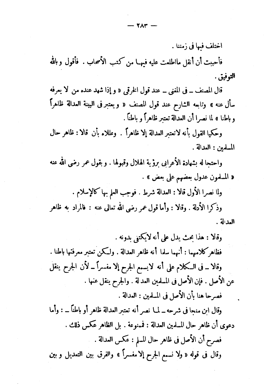 وَاحْتَجَّا لَهُ بِشَهَادَةِ الْأَعْرَابِيِّ بِرُؤْيَةِ الْهِلَالِ وَقَبُولِهَا. وَبِقَوْلِ عُمَرَ - رَضِيَ اللَّهُ عَنْهُ - " الْمُسْلِمُونَ عُدُولٌ بَعْضُهُمْ عَلَى بَعْضٍ ". وَلَمَّا نَصَرَا الْأَوَّلَ قَالَا: الْعَدَالَةُ شَرْطٌ. فَوَجَبَ الْعِلْمُ بِهَا كَالْإِسْلَامِ. وَذَكَرَا الْأَدِلَّةَ. وَقَالَا: وَأَمَّا قَوْلُ عُمَرَ - رَضِيَ اللَّهُ عَنْهُ -: فَالْمُرَادُ بِهِ ظَاهِرُ الْعَدَالَةِ. وَقَالَا: هَذَا بَحْثٌ يَدُلُّ عَلَى أَنَّهُ لَا يُكْتَفَى بِدُونِهِ. فَظَاهِرُ كَلَامِهِمَا: أَنَّهُمَا سَلَّمَا. أَنَّهُ ظَاهِرُ الْعَدَالَةِ. وَلَكِنْ تُعْتَبَرُ مَعْرِفَتُهَا بَاطِنًا. وَقَالَا فِي الْكَلَامِ عَلَى أَنَّهُ لَا يُسْمَعُ الْجَرْحُ إلَّا مُفَسَّرًا لِأَنَّ الْجَرْحَ يُنْقَلُ عَنْ الْأَصْلِ. فَإِنَّ الْأَصْلَ فِي الْمُسْلِمِينَ الْعَدَالَةُ. وَالْجَرْحُ يُنْقَلُ عَنْهَا. فَصَرَّحَا هُنَا بِأَنَّ الْأَصْلَ فِي الْمُسْلِمِينَ: الْعَدَالَةُ. وَقَالَ ابْنُ مُنَجَّا فِي شَرْحِهِ لَمَّا نُصِرَ أَنَّهُ. تُعْتَبَرُ الْعَدَالَةُ ظَاهِرًا أَوْ بَاطِنًا: وَأَمَّا دَعْوَى أَنَّ ظَاهِرَ حَالِ الْمُسْلِمِينَ الْعَدَالَةُ: فَمَمْنُوعَةٌ. بَلْ الظَّاهِرُ عَكْسُ ذَلِكَ. فَصَرَّحَ أَنَّ الْأَصْلَ فِي ظَاهِرِ حَالِ الْمُسْلِمِ: عَكْسُ الْعَدَالَةِ. وَقَالَ فِي قَوْلِهِ " وَلَا نَسْمَعُ الْجَرْحَ إلَّا مُفَسَّرًا " وَالْفَرْقُ بَيْنَ التَّعْدِيلِ وَبَيْنَ