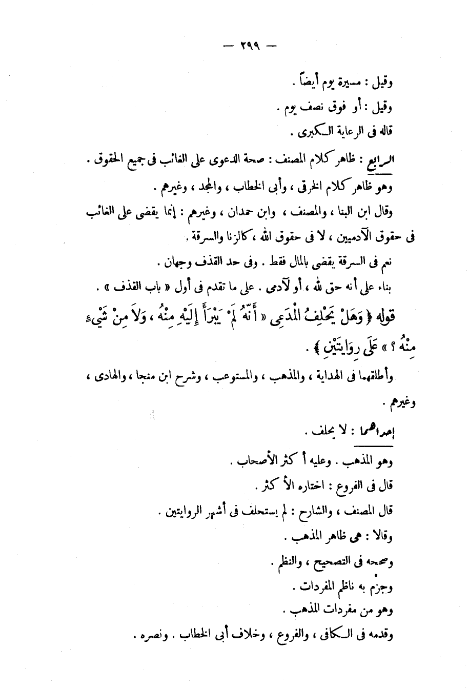 الرَّابِعُ: ظَاهِرُ كَلَامِ الْمُصَنِّفِ: صِحَّةُ الدَّعْوَى عَلَى الْغَائِبِ فِي جَمِيعِ الْحُقُوقِ. وَهُوَ ظَاهِرُ كَلَامِ الْخِرَقِيِّ، وَأَبِي الْخَطَّابِ، وَالْمَجْدِ، وَغَيْرِهِمْ. وَقَالَ ابْنُ الْبَنَّا، وَالْمُصَنِّفُ، وَابْنُ حَمْدَانَ، وَغَيْرُهُمْ: إنَّمَا يَقْضِي عَلَى الْغَائِبِ فِي حُقُوقِ الْآدَمِيِّينَ، لَا فِي حُقُوقِ اللَّهِ، كَالزِّنَا وَالسَّرِقَةِ. نَعَمْ فِي، السَّرِقَةِ يَقْضِي بِالْمَالِ فَقَطْ. وَفِي حَدِّ الْقَذْفِ وَجْهَانِ. بِنَاءٌ عَلَى أَنَّهُ حَقٌّ لِلَّهِ، أَوْ لِآدَمِيٍّ. عَلَى مَا تَقَدَّمَ فِي أَوَّلِ " بَابِ الْقَذْفِ ".
