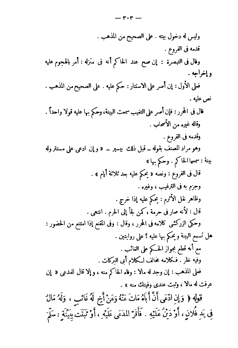 وَلَيْسَ لَهُ دُخُولُ بَيْتِهِ الصَّحِيحُ مِنْ الْمَذْهَبِ. قَدَّمَهُ فِي الْفُرُوعِ. وَقَالَ فِي التَّبْصِرَةِ: إنَّ صَحَّ عِنْدَ الْحَاكِمِ أَنَّهُ فِي مَنْزِلِهِ: أَمَرَ بِالْهُجُومِ عَلَيْهِ وَإِخْرَاجِهِ. فَعَلَى الْأَوَّلِ: إنْ أَصَرَّ عَلَى الِاسْتِتَارِ: حَكَمَ عَلَيْهِ. عَلَى الصَّحِيحِ مِنْ الْمَذْهَبِ. نَصَّ عَلَيْهِ. قَالَ فِي الْمُحَرَّرِ: فَإِنْ أَصَرَّ عَلَى التَّغَيُّبِ سُمِعَتْ الْبَيِّنَةُ، وَحُكِمَ بِهَا عَلَيْهِ قَوْلًا وَاحِدًا. وَقَالَهُ غَيْرُهُ مِنْ الْأَصْحَابِ. وَقَدَّمَهُ فِي الْفُرُوعِ. وَهُوَ مُرَادُ الْمُصَنِّفِ بِقَوْلِهِ قَبْلَ ذَلِكَ بِيَسِيرٍ " وَإِنْ ادَّعَى عَلَى مُسْتَتِرٍ وَلَهُ بَيِّنَةٌ: سَمِعَهَا الْحَاكِمُ. وَحَكَمَ بِهَا " قَالَ فِي الْفُرُوعِ: وَنَصُّهُ " يَحْكُمُ عَلَيْهِ بَعْدَ ثَلَاثَةِ أَيَّامٍ ". وَجَزَمَ بِهِ فِي التَّرْغِيبِ، وَغَيْرِهِ. وَظَاهِرُ نَقْلِ الْأَثْرَمِ: يُحْكَمُ عَلَيْهِ إذَا خَرَجَ. قَالَ: لِأَنَّهُ صَارَ فِي حُرْمَةٍ، كَمَنْ لَجَأَ إلَى الْحَرَمِ. انْتَهَى. وَحَكَى الزَّرْكَشِيُّ كَلَامَهُ فِي الْمُحَرَّرِ، وَقَالَ: وَفِي الْمُقْنِعِ إذَا امْتَنَعَ مِنْ الْحُضُورِ: هَلْ تُسْمَعُ الْبَيِّنَةُ وَيُحْكَمُ بِهَا عَلَيْهِ؟ عَلَى رِوَايَتَيْنِ. مَعَ أَنَّهُ قَطَعَ بِجَوَازِ الْحُكْمِ عَلَى الْغَائِبِ. وَفِيهِ نَظَرٌ. فَكَلَامُهُ مُخَالِفٌ لِكَلَامِ أَبِي الْبَرَكَاتِ. فَعَلَى الْمَذْهَبِ: إنْ وَجَدَ لَهُ مَالًا: وَفَّاهُ الْحَاكِمُ مِنْهُ، وَإِلَّا قَالَ لِلْمُدَّعِي " إنْ عَرَفْت لَهُ مَالًا، وَثَبَتَ عِنْدِي وَفَّيْتُك مِنْهُ ".