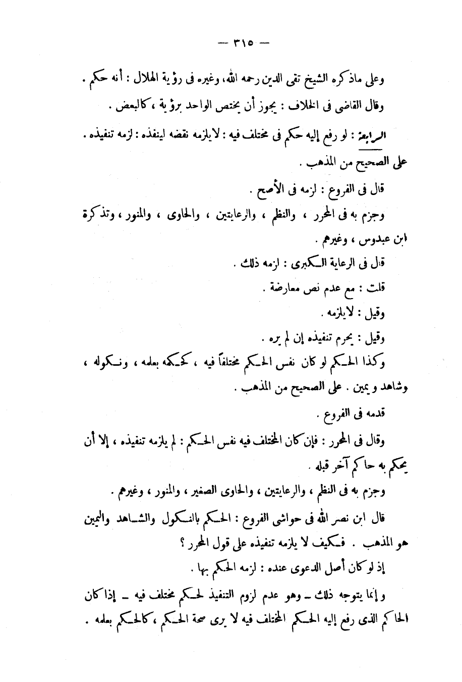الرَّابِعَةُ: لَوْ رُفِعَ إلَيْهِ حُكْمٌ فِي مُخْتَلَفٍ فِيهِ: لَا يَلْزَمُهُ نَقْضُهُ لِيُنْفِذَهُ: لَزِمَهُ تَنْفِيذُهُ. عَلَى الصَّحِيحِ مِنْ الْمَذْهَبِ. قَالَ فِي الْفُرُوعِ: لَزِمَهُ فِي الْأَصَحِّ. وَجَزَمَ بِهِ فِي الْمُحَرَّرِ، وَالنَّظْمِ، وَالرِّعَايَتَيْنِ، وَالْحَاوِي، وَالْمُنَوِّرِ، وَتَذْكِرَةِ ابْنِ عَبْدُوسٍ، وَغَيْرِهِمْ. قَالَ فِي الرِّعَايَةِ الْكُبْرَى: لَزِمَهُ ذَلِكَ. قُلْت: مَعَ عَدَمِ نَصِّ مُعَارَضَةٍ. وَقِيلَ: لَا يَلْزَمُهُ. وَقِيلَ: يَحْرُمُ تَنْفِيذُهُ إنْ لَمْ يَرَهُ. وَكَذَا الْحُكْمُ لَوْ كَانَ نَفْسُ الْحُكْمِ مُخْتَلَفًا فِيهِ، كَحُكْمِهِ بِعِلْمِهِ، وَنُكُولِهِ، وَشَاهِدٍ وَيَمِينٍ. عَلَى الصَّحِيحِ مِنْ الْمَذْهَبِ. قَدَّمَهُ فِي الْفُرُوعِ. وَقَالَ فِي الْمُحَرَّرِ: فَإِنْ كَانَ الْمُخْتَلِفُ فِيهِ نَفْسُ الْحُكْمِ: لَمْ يَلْزَمْهُ تَنْفِيذُهُ، إلَّا أَنْ يَحْكُمَ بِهِ حَاكِمٌ آخَرُ قَبْلَهُ. وَجَزَمَ بِهِ فِي النَّظْمِ، وَالرِّعَايَتَيْنِ، وَالْحَاوِي الصَّغِيرِ، وَالْمُنَوِّرِ، وَغَيْرِهِمْ. قَالَ ابْنُ نَصْرِ اللَّهِ فِي حَوَاشِي الْفُرُوعِ: الْحُكْمُ بِالنُّكُولِ وَالشَّاهِدِ وَالْيَمِينِ هُوَ الْمَذْهَبُ. فَكَيْفَ لَا يَلْزَمُهُ تَنْفِيذُهُ عَلَى قَوْلِ الْمُحَرَّرِ؟ إذْ لَوْ كَانَ أَصْلُ الدَّعْوَى عِنْدَهُ: لَزِمَهُ الْحُكْمُ بِهَا. وَإِنَّمَا يَتَوَجَّهُ ذَلِكَ وَهُوَ عَدَمُ لُزُومِ التَّنْفِيذِ لِحُكْمٍ مُخْتَلِفٍ فِيهِ إذَا كَانَ الْحَاكِمُ الَّذِي رَفَعَ إلَيْهِ الْحُكْمَ الْمُخْتَلَفَ فِيهِ لَا يَرَى صِحَّةَ الْحُكْمِ كَالْحُكْمِ بِعِلْمِهِ.