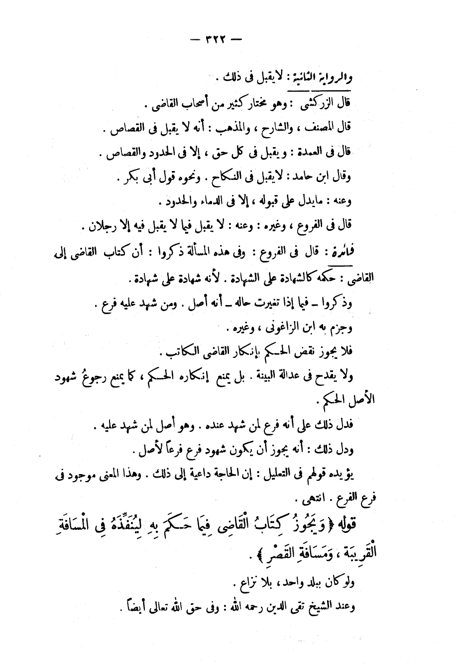 قَالَ فِي الْفُرُوعِ: وَفِي هَذِهِ الْمَسْأَلَةِ ذَكَرُوا: أَنَّ كِتَابَ الْقَاضِي إلَى الْقَاضِي: حُكْمُهُ كَالشَّهَادَةِ عَلَى الشَّهَادَةِ. لِأَنَّهُ شَهَادَةٌ عَلَى شَهَادَةٍ. وَذَكَرُوا فِيمَا إذَا تَغَيَّرَتْ حَالُهُ أَنَّهُ أَصْلٌ. وَمَنْ شَهِدَ عَلَيْهِ فَرْعٌ. وَجَزَمَ بِهِ ابْنُ الزَّاغُونِيِّ، وَغَيْرُهُ. فَلَا يَجُوزُ نَقْضُ الْحُكْمِ بِإِنْكَارِ الْقَاضِي الْكَاتِبِ. وَلَا يَقْدَحُ فِي عَدَالَةِ الْبَيِّنَةِ. بَلْ يَمْنَعُ إنْكَارُهُ الْحُكْمَ كَمَا يَمْنَعُ رُجُوعُ شُهُودِ الْأَصْلِ الْحُكْمَ. فَدَلَّ ذَلِكَ عَلَى أَنَّهُ فَرْعٌ لِمَنْ شَهِدَ عِنْدَهُ. وَهُوَ أَصْلٌ لِمَنْ شَهِدَ عَلَيْهِ. وَدَلَّ ذَلِكَ: أَنَّهُ يَجُوزُ أَنْ يَكُونَ شُهُودُ فَرْعٍ فَرْعًا لِأَصْلٍ. يُؤَيِّدُهُ قَوْلُهُمْ فِي التَّعْلِيلِ: إنَّ الْحَاجَةَ دَاعِيَةٌ إلَى ذَلِكَ. وَهَذَا الْمَعْنَى مَوْجُودٌ فِي فَرْعِ الْفَرْعِ. انْتَهَى.