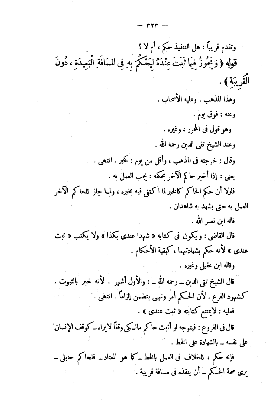 وَتَقَدَّمَ قَرِيبًا: هَلْ التَّنْفِيذُ حُكْمٌ، أَمْ لَا؟ قَوْلُهُ (وَيَجُوزُ فِيمَا ثَبَتَ عِنْدَهُ لِيَحْكُمَ بِهِ فِي الْمَسَافَةِ الْبَعِيدَةِ، دُونَ الْقَرِيبَةِ) . وَهَذَا الْمَذْهَبُ. وَعَلَيْهِ الْأَصْحَابُ. وَعَنْهُ: فَوْقَ يَوْمٍ. وَهُوَ قَوْلٌ فِي الْمُحَرَّرِ، وَغَيْرِهِ. وَعِنْدَ الشَّيْخِ تَقِيِّ الدِّينِ - رَحِمَهُ اللَّهُ -. وَقَالَ: خَرَّجْته فِي الْمَذْهَبِ، وَأَقَلُّ مِنْ يَوْمٍ: كَخَبَرٍ. انْتَهَى. يَعْنِي: إذَا أَخْبَرَ حَاكِمٌ الْآخِرَ بِحُكْمِهِ: يَجِبُ الْعَمَلُ بِهِ. فَلَوْلَا أَنَّ حُكْمَ الْحَاكِمِ كَالْخَبَرِ لَمَا اكْتَفَى فِيهِ بِخَبَرِهِ، وَلَمَا جَازَ لِلْحَاكِمِ الْآخِرِ الْعَمَلُ بِهِ حَتَّى يَشْهَدَ بِهِ شَاهِدَانِ. قَالَهُ ابْنُ نَصْرِ اللَّهِ. قَالَ الْقَاضِي: وَيَكُونُ فِي كِتَابِهِ " شَهِدَا عِنْدِي بِكَذَا " وَلَا يَكْتُبُ " ثَبَتَ عِنْدِي " لِأَنَّهُ حَكَمَ بِشَهَادَتِهِمَا، كَبَقِيَّةِ الْأَحْكَامِ.