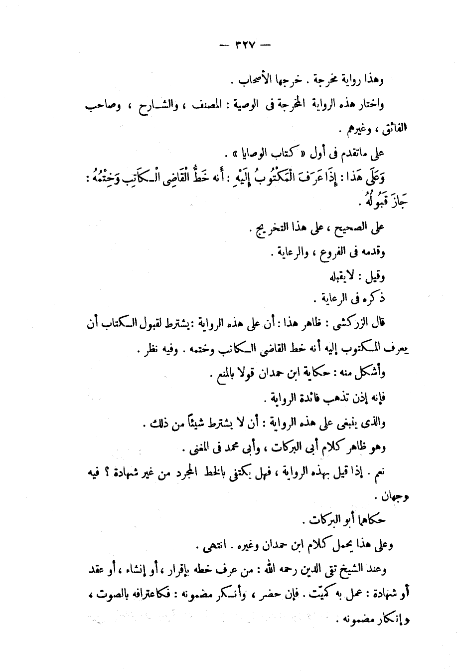 وَقِيلَ: لَا يَقْبَلُهُ ذَكَرَهُ فِي الرِّعَايَةِ. قَالَ الزَّرْكَشِيُّ: ظَاهِرُ هَذَا: أَنَّ عَلَى هَذِهِ الرِّوَايَةِ: يُشْتَرَطُ لِقَبُولِ الْكِتَابِ أَنْ يَعْرِفَ الْمَكْتُوبُ إلَيْهِ أَنَّهُ خَطُّ الْقَاضِي الْكَاتِبِ وَخَتْمُهُ. وَفِيهِ نَظَرٌ. وَأَشْكَلُ مِنْهُ: حِكَايَةُ ابْنِ حَمْدَانَ قَوْلًا بِالْمَنْعِ. فَإِنَّهُ إذَنْ تَذْهَبُ فَائِدَةُ الرِّوَايَةِ. وَاَلَّذِي يَنْبَغِي عَلَى هَذِهِ الرِّوَايَةِ: أَنْ لَا يَشْتَرِطَ شَيْئًا مِنْ ذَلِكَ. وَهُوَ ظَاهِرُ كَلَامِ أَبِي الْبَرَكَاتِ، وَأَبِي مُحَمَّدٍ فِي الْمُغْنِي. نَعَمْ. إذَا قِيلَ بِهَذِهِ الرِّوَايَةِ، فَهَلْ يَكْتَفِي بِالْخَطِّ الْمُجَرَّدِ مِنْ غَيْرِ شَهَادَةٍ؟ فِيهِ وَجْهَانِ. حَكَاهُمَا أَبُو الْبَرَكَاتِ. وَعَلَى هَذَا يُحْمَلُ كَلَامُ ابْنِ حَمْدَانَ وَغَيْرِهِ. انْتَهَى. وَعِنْدَ الشَّيْخِ تَقِيِّ الدِّينِ - رَحِمَهُ اللَّهُ -: مَنْ عُرِفَ خَطُّهُ بِإِقْرَارٍ، أَوْ إنْشَاءٍ، أَوْ عَقْدٍ أَوْ شَهَادَةٍ: عُمِلَ بِهِ كَمَيِّتٍ. فَإِنْ حَضَرَ، وَأَنْكَرَ مَضْمُونَهُ: فَكَاعْتِرَافِهِ بِالصَّوْتِ، وَإِنْكَارِ مَضْمُونِهِ.