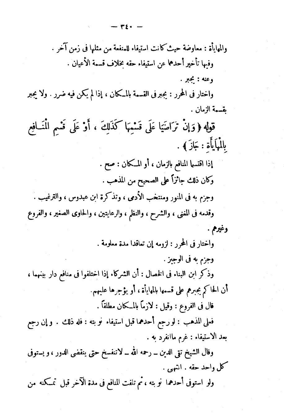 وَالْمُهَايَأَةُ: مُعَاوَضَةٌ حَيْثُ كَانَتْ اسْتِيفَاءً لِلْمَنْفَعَةِ مِنْ مِثْلِهَا فِي زَمَنٍ آخَرَ. وَفِيهَا تَأْخِيرُ أَحَدِهِمَا عَنْ اسْتِيفَاءِ حَقِّهِ بِخِلَافِ قِسْمَةِ الْأَعْيَانِ. وَعَنْهُ: يُجْبَرُ. وَاخْتَارَ فِي الْمُحَرَّرِ: يُجْبَرُ فِي الْقِسْمَةِ بِالْمَكَانِ، إذَا لَمْ يَكُنْ فِيهِ ضَرَرٌ. وَلَا يُجْبَرُ بِقِسْمَةِ الزَّمَانِ. قَوْلُهُ (وَإِنْ تَرَاضَيَا عَلَى قَسْمِهَا كَذَلِكَ، أَوْ عَلَى قَسْمِ الْمَنَافِعِ بِالْمُهَايَأَةِ: جَازَ) . إذَا اقْتَسَمَا الْمَنَافِعَ بِالزَّمَانِ، أَوْ الْمَكَانِ: صَحَّ. وَكَانَ ذَلِكَ جَائِزًا عَلَى الصَّحِيحِ مِنْ الْمَذْهَبِ. وَجَزَمَ بِهِ فِي الْمُنَوِّرِ وَمُنْتَخَبِ الْأَدَمِيِّ، وَتَذْكِرَةِ ابْنِ عَبْدُوسٍ، وَالتَّرْغِيبِ. وَقَدَّمَهُ فِي الْمُغْنِي، وَالشَّرْحِ، وَالنَّظْمِ، وَالرِّعَايَتَيْنِ، وَالْحَاوِي الصَّغِيرِ، وَالْفُرُوعِ وَغَيْرِهِمْ. وَاخْتَارَ فِي الْمُحَرَّرِ: لُزُومَهُ إنْ تَعَاقَدَا مُدَّةً مَعْلُومَةً. وَجَزَمَ بِهِ فِي الْوَجِيزِ. وَذَكَرَ ابْنُ الْبَنَّا فِي الْخِصَالِ: أَنَّ الشُّرَكَاءَ إذَا اخْتَلَفُوا فِي مَنَافِعِ دَارٍ بَيْنَهُمَا، أَنَّ الْحَاكِمَ يُجْبِرُهُمْ عَلَى قَسْمِهَا بِالْمُهَايَأَةِ، أَوْ يُؤَجِّرُهَا عَلَيْهِمْ. قَالَ فِي الْفُرُوعِ: وَقِيلَ: لَازِمًا بِالْمَكَانِ مُطْلَقًا. فَعَلَى الْمَذْهَبِ: لَوْ رَجَعَ أَحَدُهُمَا قَبْلَ اسْتِيفَاءِ نَوْبَتِهِ: فَلَهُ ذَلِكَ. وَإِنْ رَجَعَ بَعْدَ الِاسْتِيفَاءِ: غَرِمَ مَا انْفَرَدَ بِهِ. وَقَالَ الشَّيْخُ تَقِيُّ الدِّينِ - رَحِمَهُ اللَّهُ - لَا تَنْفَسِخُ حَتَّى يَنْقَضِيَ الدُّورُ، وَيَسْتَوْفِي كُلُّ وَاحِدٍ حَقَّهُ. انْتَهَى. وَلَوْ اسْتَوْفَى أَحَدُهُمَا نَوْبَتَهُ، ثُمَّ تَلِفَتْ الْمَنَافِعُ فِي مُدَّةِ الْآخَرِ قَبْلَ تَمَكُّنِهِ مِنْ