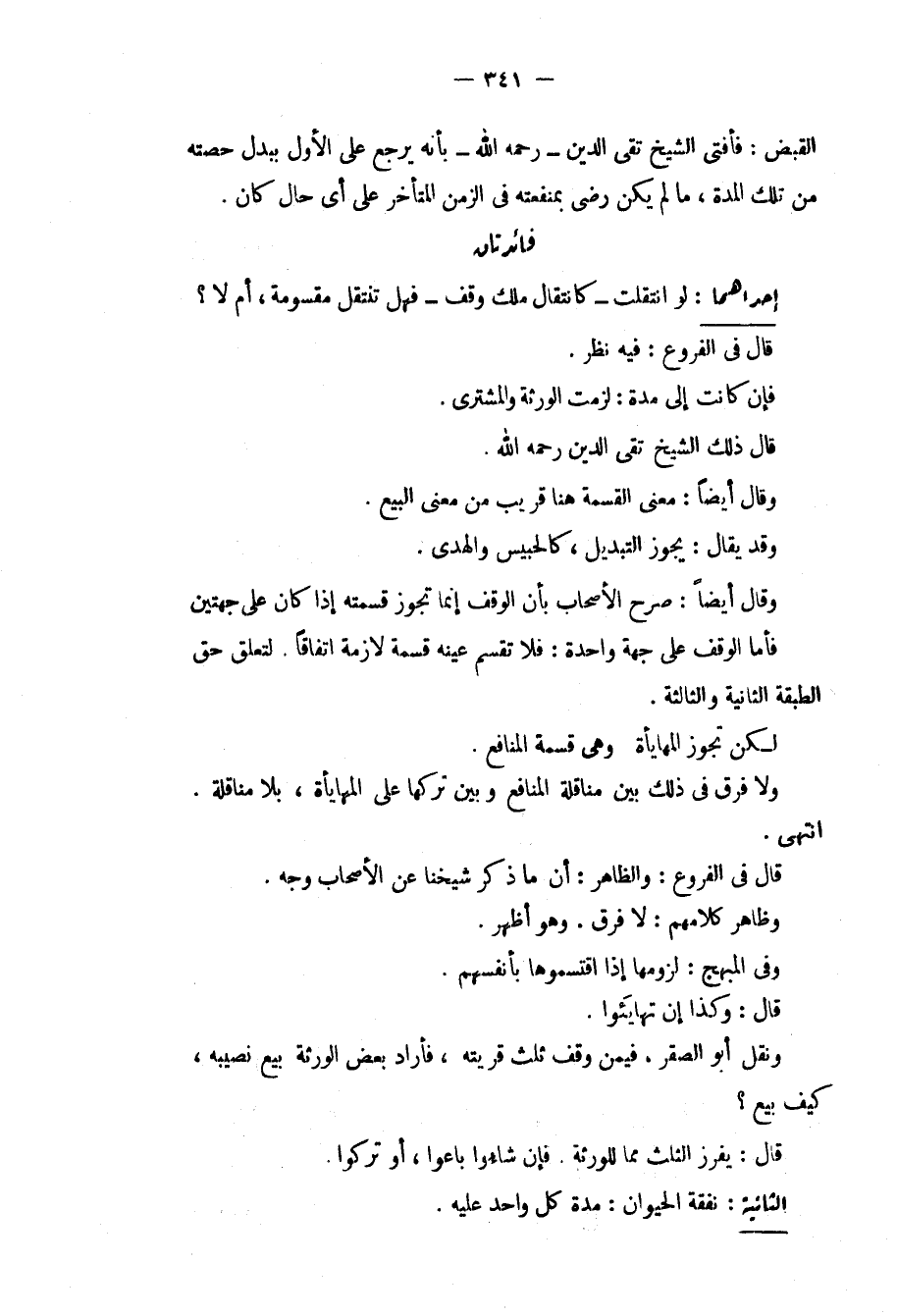 الْقَبْضِ: فَأَفْتَى الشَّيْخُ تَقِيُّ الدِّينِ - رَحِمَهُ اللَّهُ - بِأَنَّهُ يَرْجِعُ عَلَى الْأَوَّلِ بِبَدَلِ حِصَّتِهِ مِنْ تِلْكَ الْمُدَّةِ مَا لَمْ يَكُنْ رَضِيَ بِمَنْفَعَتِهِ فِي الزَّمَنِ الْمُتَأَخِّرِ عَلَى أَيِّ حَالٍ كَانَ. فَائِدَتَانِ