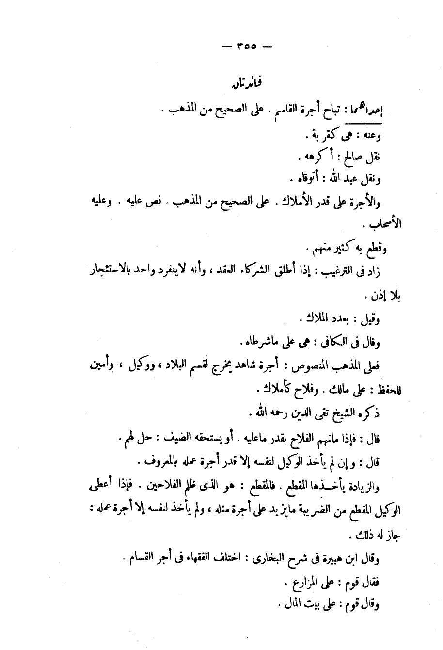 فَائِدَتَانِ إحْدَاهُمَا: تُبَاحُ أُجْرَةُ الْقَاسِمِ. عَلَى الصَّحِيحِ مِنْ الْمَذْهَبِ. وَعَنْهُ: هِيَ كَقُرْبَةٍ. نَقَلَ صَالِحٌ: أَكْرَهُهُ. وَنَقَلَ عَبْدُ اللَّهِ: أَتَوَقَّاهُ وَالْأُجْرَةُ عَلَى قَدْرِ الْأَمْلَاكِ. عَلَى الصَّحِيحِ مِنْ الْمَذْهَبِ. نَصَّ عَلَيْهِ. وَعَلَيْهِ الْأَصْحَابُ. وَقَطَعَ بِهِ كَثِيرٌ مِنْهُمْ. زَادَ فِي التَّرْغِيبِ: إذَا أَطْلَقَ الشُّرَكَاءُ الْعَقْدَ، وَأَنَّهُ لَا يَنْفَرِدُ وَاحِدٌ بِالِاسْتِئْجَارِ بِلَا إذْنٍ. وَقِيلَ: بِعَدَدِ الْمُلَّاكِ. وَقَالَ فِي الْكَافِي: هِيَ عَلَى مَا شَرَطَاهُ. فَعَلَى الْمَذْهَبِ الْمَنْصُوصِ: أُجْرَةُ شَاهِدٍ يَخْرُجُ لِقِسْمِ الْبِلَادِ، وَوَكِيلٍ، وَأَمِينٍ لِلْحِفْظِ: عَلَى مَالِكٍ. وَفَلَّاحٍ كَأَمْلَاكٍ. ذَكَرَهُ الشَّيْخُ تَقِيُّ الدِّينِ - رَحِمَهُ اللَّهُ -. قَالَ: فَإِذَا مَا نَهِمَ الْفَلَّاحُ بِقَدْرِ مَا عَلَيْهِ أَوْ يَسْتَحِقُّهُ الضَّيْفُ: حَلَّ لَهُمْ. قَالَ: وَإِنْ لَمْ يَأْخُذْ الْوَكِيلُ لِنَفْسِهِ إلَّا قَدْرَ عَمَلِهِ بِالْمَعْرُوفِ. وَالزِّيَادَةِ يَأْخُذُهَا الْمُقْطِعُ. فَالْمُقْطِعُ: هُوَ الَّذِي ظَلَمَ الْفَلَّاحِينَ. فَإِذَا أَعْطَى الْوَكِيلُ الْمُقْطِعَ مِنْ الضَّرِيبَةِ مَا يَزِيدُ عَلَى أُجْرَةِ مِثْلِهِ، وَلَمْ يَأْخُذْ لِنَفْسِهِ إلَّا أُجْرَةَ عَمَلِهِ: جَازَ لَهُ ذَلِكَ. وَقَالَ ابْنُ هُبَيْرَةَ فِي شَرْحِ الْبُخَارِيِّ: اخْتَلَفَ الْفُقَهَاءُ فِي أَجْرِ الْقَسَّامِ فَقَالَ قَوْمٌ: عَلَى الْمُزَارِعِ. وَقَالَ قَوْمٌ: عَلَى بَيْتِ الْمَالِ.