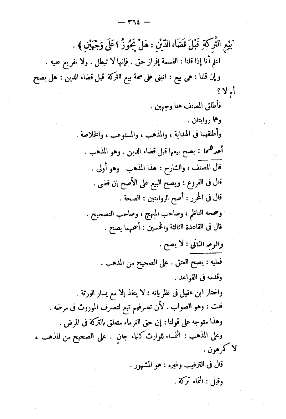 بَيْعِ التَّرِكَةِ قَبْلَ قَضَاءِ الدَّيْنِ: هَلْ يَجُوزُ؟ عَلَى وَجْهَيْنِ) . اعْلَمْ أَنَّا إذَا قُلْنَا: الْقِسْمَةُ إفْرَازُ حَقٍّ. فَإِنَّهَا لَا تَبْطُلُ. وَلَا تَفْرِيعَ عَلَيْهِ. وَإِنْ قُلْنَا: هِيَ بَيْعٌ: انْبَنَى عَلَى صِحَّةِ بَيْعِ التَّرِكَةِ قَبْلَ قَضَاءِ الدَّيْنِ: هَلْ يَصِحُّ أَمْ لَا؟ فَأَطْلَقَ الْمُصَنِّفُ هُنَا وَجْهَيْنِ. وَهُمَا رِوَايَتَانِ. وَأَطْلَقَهُمَا فِي الْهِدَايَةِ، وَالْمُذْهَبِ، وَالْمُسْتَوْعِبِ، وَالْخُلَاصَةِ.