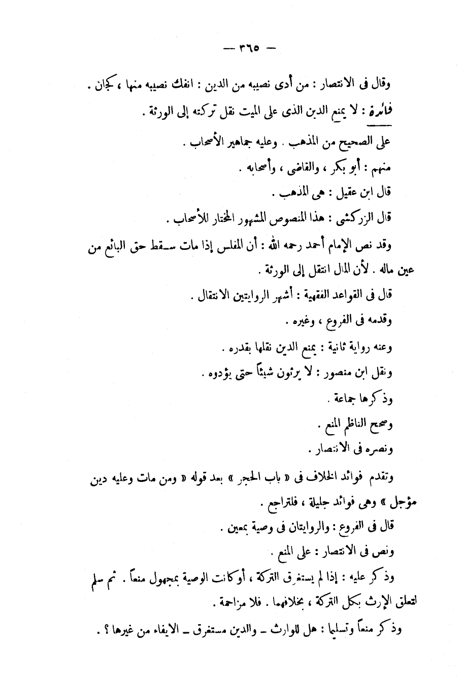 فَائِدَةٌ: لَا يَمْنَعُ الدَّيْنُ الَّذِي عَلَى الْمَيِّتِ نَقْلَ تَرِكَتِهِ إلَى الْوَرَثَةِ. عَلَى الصَّحِيحِ مِنْ الْمَذْهَبِ. وَعَلَيْهِ جَمَاهِيرُ الْأَصْحَابِ. مِنْهُمْ: أَبُو بَكْرٍ، وَالْقَاضِي، وَأَصْحَابُهُ. قَالَ ابْنُ عَقِيلٍ: هِيَ الْمَذْهَبُ. قَالَ الزَّرْكَشِيُّ: هَذَا الْمَنْصُوصُ الْمَشْهُورُ الْمُخْتَارُ لِلْأَصْحَابِ. وَقَدْ نَصَّ الْإِمَامُ أَحْمَدُ - رَحِمَهُ اللَّهُ -: أَنَّ الْمُفْلِسَ إذْ مَاتَ سَقَطَ حَقُّ الْبَائِعِ مِنْ عَيْنِ مَالِهِ. لِأَنَّ الْمَالَ انْتَقَلَ إلَى الْوَرَثَةِ. قَالَ فِي الْقَوَاعِدِ الْفِقْهِيَّةِ: أَشْهَرُ الرِّوَايَتَيْنِ الِانْتِقَالُ. وَقَدَّمَهُ فِي الْفُرُوعِ، وَغَيْرِهِ. وَعَنْهُ رِوَايَةٌ ثَانِيَةٌ: يَمْنَعُ الدَّيْنُ نَقْلَهَا بِقَدْرِهِ. وَنَقَلَ ابْنُ مَنْصُورٍ: لَا يَرِثُونَ شَيْئًا حَتَّى يُؤَدُّوهُ. وَذَكَرَهَا جَمَاعَةٌ. وَصَحَّحَ النَّاظِمُ الْمَنْعَ. وَنَصَرَهُ فِي الِانْتِصَارِ. وَتَقَدَّمَ فَوَائِدُ الْخِلَافِ فِي (بَابِ الْحَجْرِ) بَعْدَ قَوْلِهِ (وَمَنْ مَاتَ وَعَلَيْهِ دَيْنٌ مُؤَجَّلٌ) وَهِيَ فَوَائِدُ جَلِيلَةٌ، فَلْتُرَاجَعْ. قَالَ فِي الْفُرُوعِ: وَالرِّوَايَتَانِ فِي وَصِيَّةٍ بِمُعَيَّنٍ. وَنَصَّ فِي الِانْتِصَارِ: عَلَى الْمَنْعِ. وَذَكَرَهُ عَلَيْهِ: إذَا لَمْ يَسْتَغْرِقْ التَّرِكَةَ، أَوْ كَانَتْ الْوَصِيَّةُ بِمَجْهُولٍ مَنْعًا. ثُمَّ سَلَّمَ لِتَعَلُّقِ الْإِرْثِ بِكُلِّ التَّرِكَةِ، بِخِلَافِهِمَا. فَلَا مُزَاحَمَةَ. وَذَكَرَ مَنْعًا وَتَسْلِيمًا: هَلْ لِلْوَارِثِ وَالدَّيْنُ مُسْتَغْرِقٌ الْإِيفَاءُ مِنْ غَيْرِهَا؟ .