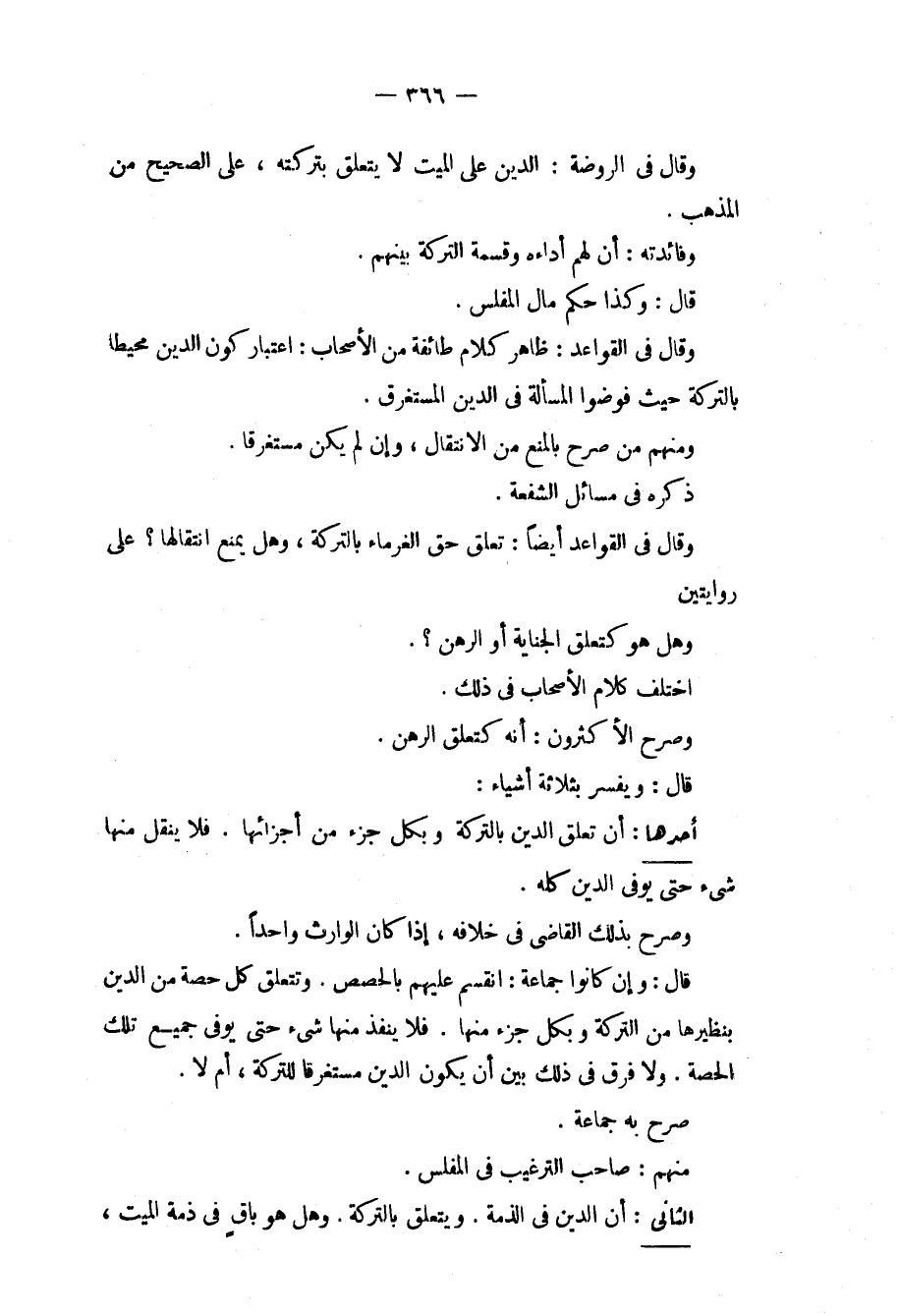 أَنَّ لَهُمْ أَدَاءَهُ وَقِسْمَةَ التَّرِكَةِ بَيْنَهُمْ. قَالَ: وَكَذَا حُكْمُ مَالِ الْمُفْلِسِ. وَقَالَ فِي الْقَوَاعِدِ: ظَاهِرُ كَلَامِ طَائِفَةٍ مِنْ الْأَصْحَابِ: اعْتِبَارُ كَوْنِ الدَّيْنِ مُحِيطًا بِالتَّرِكَةِ حَيْثُ فَوَّضُوا الْمَسْأَلَةَ فِي الدَّيْنِ الْمُسْتَغْرِقِ. وَمِنْهُمْ مَنْ صَرَّحَ بِالْمَنْعِ مِنْ الِانْتِقَال، وَإِنْ لَمْ يَكُنْ مُسْتَغْرِقًا. ذَكَرَهُ فِي مَسَائِلِ الشُّفْعَةِ. وَقَالَ فِي الْقَوَاعِدِ أَيْضًا: تَعَلَّقَ حَقُّ الْغُرَمَاءِ بِالتَّرِكَةِ، وَهَلْ يَمْنَعُ انْتِقَالَهَا؟ عَلَى رِوَايَتَيْنِ. وَهَلْ هُوَ كَتَعَلُّقِ الْجِنَايَةِ أَوْ الرَّهْنِ؟ اخْتَلَفَ كَلَامُ الْأَصْحَابِ فِي ذَلِكَ. وَصَرَّحَ الْأَكْثَرُونَ: أَنَّهُ كَتَعَلُّقِ الرَّهْنِ. قَالَ: وَيُفَسَّرُ بِثَلَاثَةِ أَشْيَاءَ: