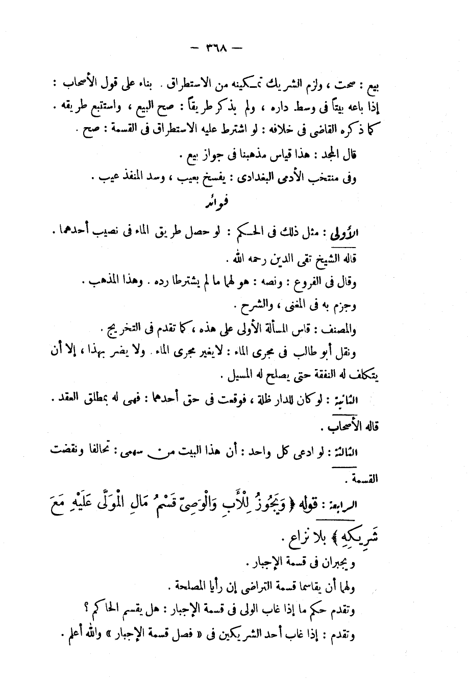 بَيْعٌ: صَحَّتْ، وَلَزِمَ الشَّرِيكُ تَمْكِينَهُ مِنْ الِاسْتِطْرَاقِ. بِنَاءً عَلَى قَوْلِ الْأَصْحَابِ: إذَا بَاعَهُ بَيْتًا فِي وَسَطِ دَارِهِ، وَلَمْ يَذْكُرْ طَرِيقًا: صَحَّ الْبَيْعُ، وَاسْتَتْبَعَ طَرِيقَهُ كَمَا ذَكَرَهُ الْقَاضِي فِي خِلَافِهِ: لَوْ اشْتَرَطَ عَلَيْهِ الِاسْتِطْرَاقَ فِي الْقِسْمَةِ: صَحَّ قَالَ الْمَجْدُ: هَذَا قِيَاسُ مَذْهَبِنَا فِي جَوَازِ بَيْعٍ. وَفِي مُنْتَخَبِ الْأَدَمِيِّ الْبَغْدَادِيِّ: يُفْسَخُ بِعَيْبٍ، وَسَدُّ الْمَنْفَذِ عَيْبٌ. فَوَائِدُ