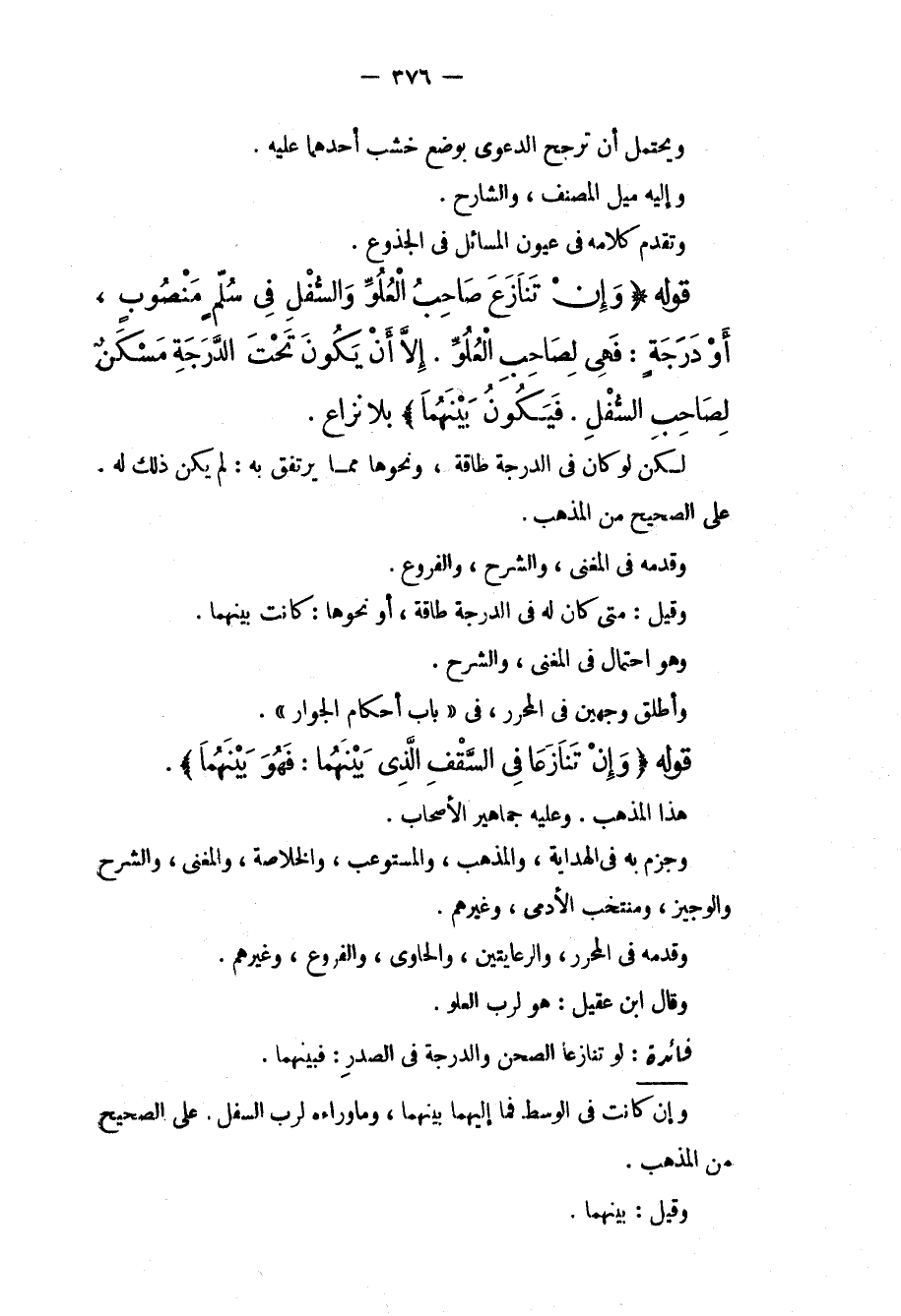 قَوْلُهُ (وَإِنْ تَنَازَعَ صَاحِبُ الْعُلْوِ وَالسُّفْلِ فِي سُلَّمٍ مَنْصُوبٍ، أَوْ دَرَجَةٍ: فَهِيَ لِصَاحِبِ الْعُلْوِ. إلَّا أَنْ يَكُونَ تَحْتَ الدَّرَجَةِ مَسْكَنٌ لِصَاحِبِ السُّفْلِ. فَيَكُونُ بَيْنَهُمَا) بِلَا نِزَاعٍ. لَكِنْ لَوْ كَانَ فِي الدَّرَجَةِ طَاقَةٌ، وَنَحْوُهَا مِمَّا يَرْتَفِقُ بِهِ: لَمْ يَكُنْ ذَلِكَ لَهُ عَلَى الصَّحِيحِ مِنْ الْمَذْهَبِ. وَقَدَّمَهُ فِي الْمُغْنِي وَالشَّرْحِ، وَالْفُرُوعِ. وَقِيلَ: مَتَى كَانَ لَهُ فِي الدَّرَجَةِ طَاقَةٌ، أَوْ نَحْوُهَا: كَانَتْ بَيْنَهُمَا. وَهُوَ احْتِمَالٌ فِي الْمُغْنِي، وَالشَّرْحِ. وَأَطْلَقَ وَجْهَيْنِ فِي الْمُحَرَّرِ، فِي " بَابِ أَحْكَامِ الْجِوَارِ ". قَوْلُهُ (وَإِنْ تَنَازَعَا فِي السَّقْفِ الَّذِي بَيْنَهُمَا: فَهُوَ بَيْنَهُمَا) . هَذَا الْمَذْهَبُ. وَعَلَيْهِ جَمَاهِيرُ الْأَصْحَابِ. وَجَزَمَ بِهِ فِي الْهِدَايَةِ، وَالْمُذْهَبِ، وَالْمُسْتَوْعِبِ، وَالْخُلَاصَةِ، وَالْمُغْنِي، وَالشَّرْحِ وَالْوَجِيزِ، وَمُنْتَخَبِ الْأَدَمِيِّ، وَغَيْرِهِمْ. وَقَدَّمَهُ فِي الْمُحَرَّرِ، وَالرِّعَايَتَيْنِ، وَالْحَاوِي، وَالْفُرُوعِ، وَغَيْرِهِمْ. وَقَالَ ابْنُ عَقِيلٍ: هُوَ لِرَبِّ الْعُلْوِ.