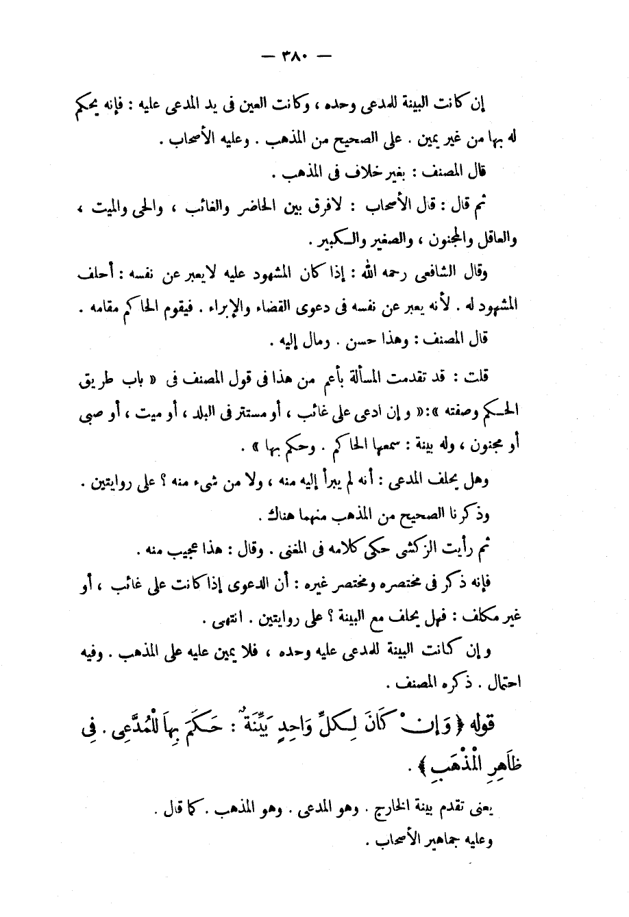 إنْ كَانَتْ الْبَيِّنَةُ لِلْمُدَّعِي وَحْدَهُ، وَكَانَتْ الْعَيْنُ فِي يَدِ الْمُدَّعَى عَلَيْهِ: فَإِنَّهُ يُحْكَمُ لَهُ بِهَا مِنْ غَيْرِ يَمِينٍ. عَلَى الصَّحِيحِ مِنْ الْمَذْهَبِ. وَعَلَيْهِ الْأَصْحَابُ. قَالَ الْمُصَنِّفُ: بِغَيْرِ خِلَافٍ فِي الْمَذْهَبِ. ثُمَّ قَالَ: قَالَ الْأَصْحَابُ: لَا فَرْقَ بَيْنَ الْحَاضِرِ وَالْغَائِبِ، وَالْحَيِّ وَالْمَيِّتِ، وَالْعَاقِلِ وَالْمَجْنُونِ، وَالصَّغِيرِ وَالْكَبِيرِ. وَقَالَ الشَّافِعِيُّ - رَحِمَهُ اللَّهُ -: إذَا كَانَ الْمَشْهُودُ عَلَيْهِ لَا يُعَبِّرُ عَنْ نَفْسِهِ: أَحَلَفَ الْمَشْهُودَ لَهُ. لِأَنَّهُ يُعَبِّرُ عَنْ نَفْسِهِ فِي دَعْوَى الْقَضَاءِ وَالْإِبْرَاءِ. فَيَقُومُ الْحَاكِمُ مَقَامَهُ قَالَ الْمُصَنِّفُ: وَهَذَا حَسَنٌ. وَمَالَ إلَيْهِ. قُلْت: قَدْ تَقَدَّمَتْ الْمَسْأَلَةُ بِأَعَمَّ مِنْ هَذَا فِي قَوْلِ الْمُصَنِّفِ فِي " بَابِ طَرِيقِ الْحُكْمِ وَصِفَتِهِ ": " وَإِنْ ادَّعَى عَلَى غَائِبٍ أَوْ مُسْتَتِرٍ فِي الْبَلَدِ، أَوْ مَيِّتٍ، أَوْ صَبِيٍّ أَوْ مَجْنُونٍ، وَلَهُ بَيِّنَةٌ: سَمِعَهَا الْحَاكِمُ. وَحَكَمَ بِهَا ". وَهَلْ يَحْلِفُ الْمُدَّعِي: أَنَّهُ لَمْ يَبْرَأْ إلَيْهِ مِنْهُ، وَلَا مِنْ شَيْءٍ مِنْهُ؟ عَلَى رِوَايَتَيْنِ. وَذَكَرْنَا الصَّحِيحَ مِنْ الْمَذْهَبِ مِنْهُمَا هُنَاكَ. ثُمَّ رَأَيْت الزَّرْكَشِيَّ حَكَى كَلَامَهُ فِي الْمُغْنِي. وَقَالَ: هَذَا عَجِيبٌ مِنْهُ. فَإِنَّهُ ذَكَرَ فِي مُخْتَصَرِهِ وَمُخْتَصَرِ غَيْرِهِ: أَنَّ الدَّعْوَى إذَا كَانَتْ عَلَى غَائِبٍ، أَوْ غَيْرِ مُكَلَّفٍ: فَهَلْ يَحْلِفُ مَعَ الْبَيِّنَةِ؟ عَلَى الرِّوَايَتَيْنِ. انْتَهَى.