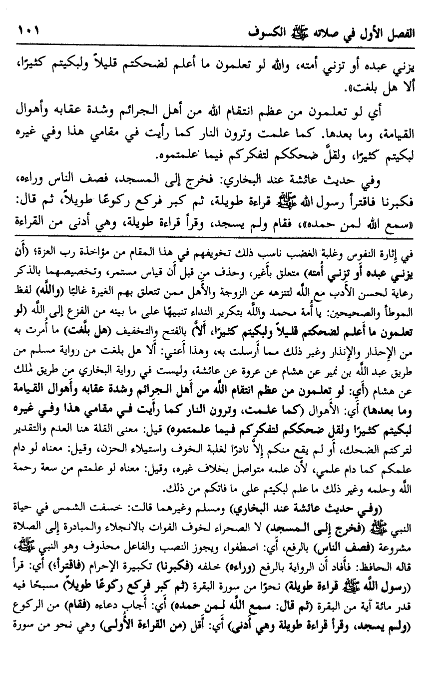 وفي حديث عائشة عند البخاري: فخرج إلى المسجد، فصف الناس وراءه، فكبرنا فاقترأ رسول الله -صلى الله عليه وسلم- قراءة طويلة، ثم كبر فركع ركوعا طويلا، ثم قال: "سمع الله لمن حمده"، فقام ولم يسجد، وقرأ قراءة طويلة، وهي أدنى من القراءة