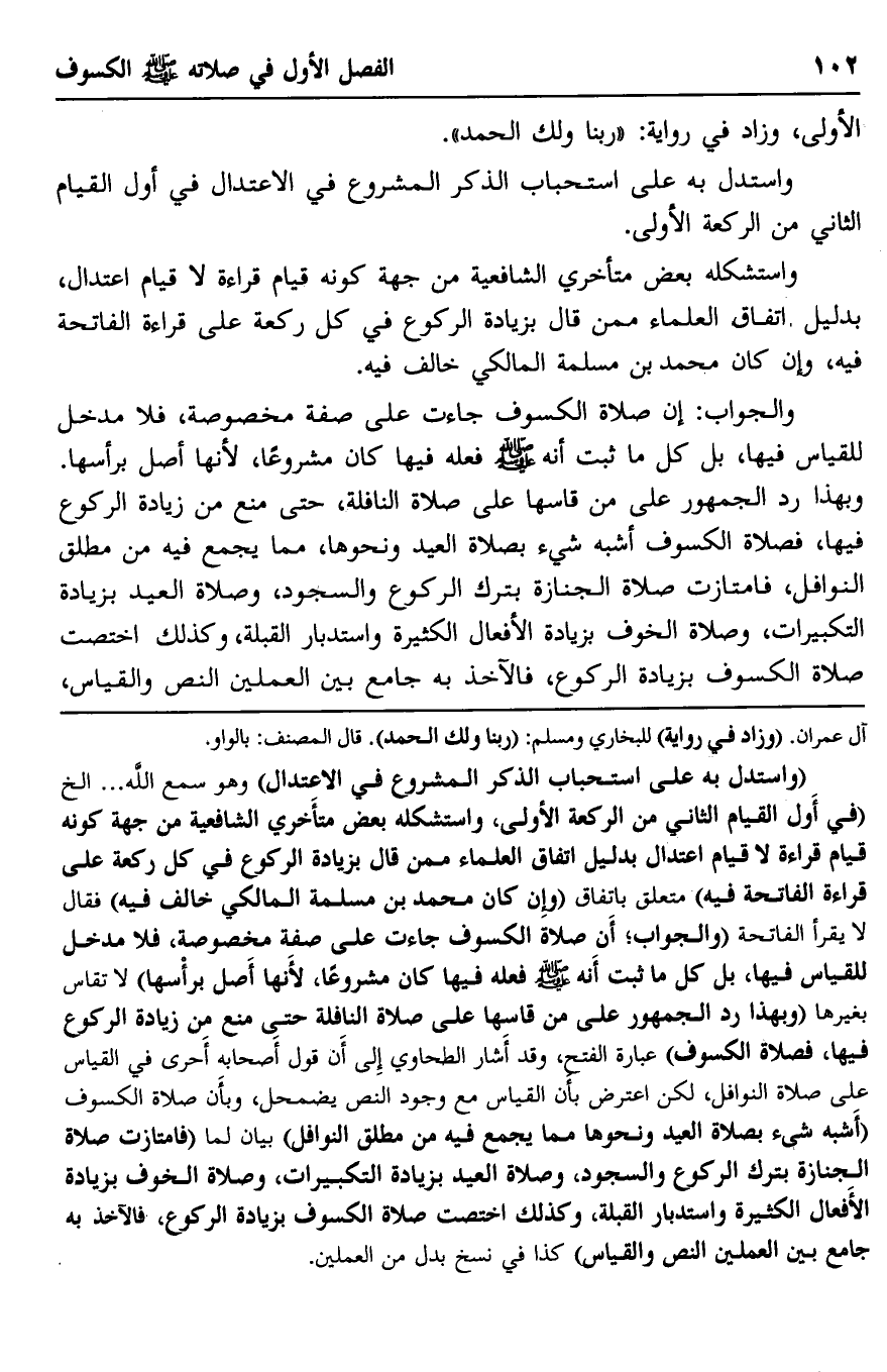 والجواب: إن صلاة الكسوف جاءت على صفة مخصوصة، فلا مدخل للقياس فيها، بل كل ما ثبت أنه -صلى الله عليه وسلم- فعله فيها كان مشروعا؛ لأنها أصل برأسها. وبهذا رد الجمهور على من قاسها على صلاة النافلة، حتى منع من زيادة الركوع فيها، فصلاة الكسوف أشبه شيء بصلاة العيد ونحوها، مما يجمع فيه من مطلق النوافل، فامتازت صلاة الجنازة بترك الركوع والسجود، وصلاة العيد بزيادة التكبيرات، وصلاة الخوف بزيادة الأفعال الكثيرة واستدبار القبلة، وكذلك اختصت صلاة الكسوف بزيادة الركوع، فالآخذ به جامع بين العملين النص والقياس،