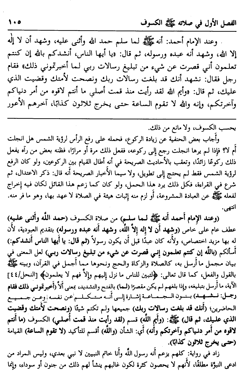 "وعند الإمام أحمد أنه -صلى الله عليه وسلم- لما سلم" من صلاة الكسوف "حمد الله وأثنى عليه" عطف عام على خاص "وشهد أن لا إله إلا الله، وشهد أنه عبده ورسوله" بتقديم العبودية؛ لأن له بها مزيد اختصاص؛ ولأنه كان عبدا قبل أن يكون رسولا "ثم قال: "يا أيها الناس أنشدكم": أسألكم "بالله إن كنتم تعلمون أني قصرت عن شيء من تبليغ رسالات ربي" لعل المعنى في بيان مجمل ما أرسل به، كالصلاة والزكاة والحج ونحوها مما أجمل في القرآن، وبينه -صلى الله عليه وسلم- بالقول والفعل، كما قال تعالى: {لِتُبَيِّنَ لِلنَّاسِ مَا نُزِّلَ إِلَيْهِمْ وَلَعَلَّهُمْ يَتَفَكَّرُونَ} [النحل: 44] الآية، ما أرسل بتبليغه، وإذا بلغهم لم يكن مقصرا "لما" بالفتح والتشديد، بمعنى ألا "أخبرتموني ذلك فقام رجل: فقال: نشهد" بنون الجماعة إشارة إلى أنه متكلم عن نفسه وعن جميع الحاضرين؛ "أنك قد بلغت رسالات ربك" جميعها ولم تكتم شيئا "ونصحت لأمتك وقضيت الذي عليك"، ثم قال صلى الله عليه وسلم: "وأيم الله" قسم "لقد رأيت منذ قمت أصلي" الكسوف "ما أنتم لاقوه من أمر دنياكم وآخرتكم وأنه" أي: الشأن "والله" أقسم للتأكيد "لا تقوم الساعة" القيامة "حتى يخرج ثلاثون كذابا".