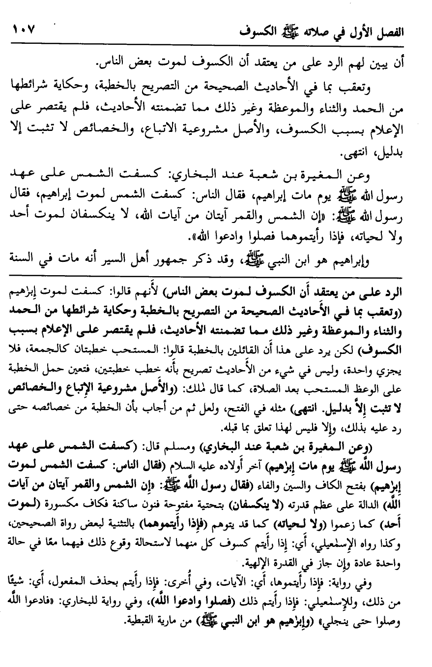وعن المغيرة بن شعبة عند البخاري: كسفت الشمس على عهد رسول الله -صلى الله عليه وسلم- يوم مات إبراهيم، فقال الناس: كسفت الشمس لموت إبراهيم، فقال رسول الله -صلى الله عليه وسلم: "إن الشمس والقمر آيتان من آيات الله، لا ينكسفان لموت أحد ولا لحياته، فإذا رأيتموهما فصلوا وادعوا الله".