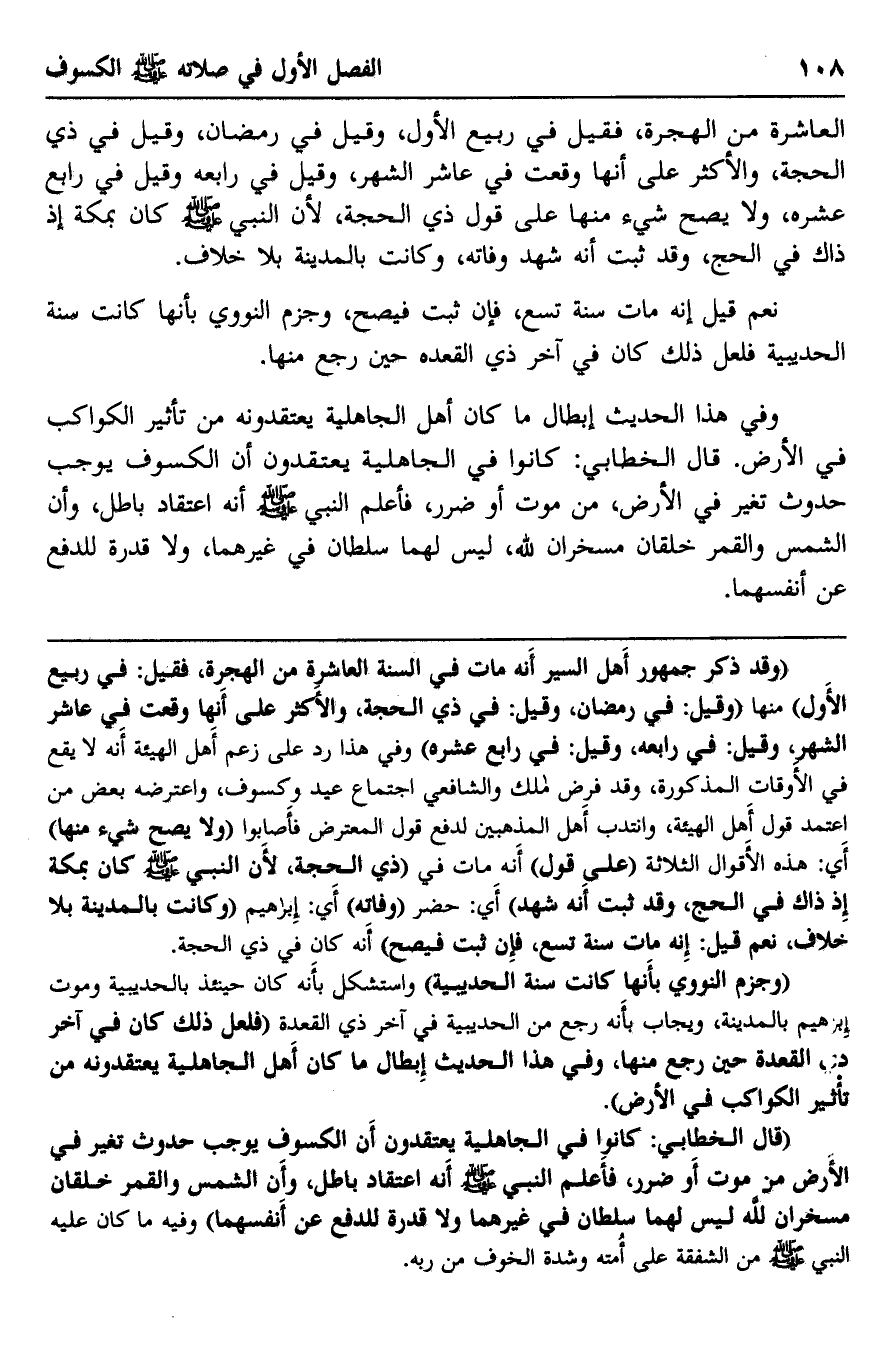 "وقد ذكر جمهور أهل السير أنه مات في السنة العاشرة من الهجرة، فقيل: في ربيع الأول" منها "وقيل: في رمضان، وقيل: في ذي الحجة، والأكثر على أنها وقعت في عاشر الشهر، وقيل: في رابعه، وقيل: في رابع عشره" وفي هذا رد على زعم أهل الهيئة أنه لا يقع في الأوقات المذكورة، وقد فرض مالك والشافعي اجتماع عيد وكسوف، واعترضه بعض من اعتمد قول أهل الهيئة، وانتدب أهل المذهبين لدفع قول المعترض فأصابوا "ولا يصح شيء منها" أي: هذه الأقوال الثلاثة "على قول" أنه مات في "ذي الحجة؛ لأن النبي -صلى الله عليه وسلم- كان بمكة إذ ذاك في الحج، وقد ثبت أنه شهد" أي: حضر "وفاته" أي: إبراهيم "وكانت بالمدينة بلا خلاف، نعم قيل: إنه مات سنة تسع، فإن ثبت فيصح" أنه كان في ذي الحجة.