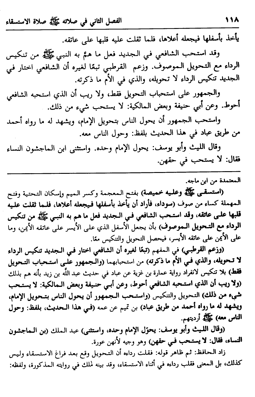 "وزعم القرطبي" في المفهم "تبعا لغيره أن الشافعي اختار في الجديد تنكيس الرداء لا تحويله، والذي في الأم ما ذكرته" من استحبابهما "والجمهور على استحباب التحويل فقط" بلا تنكيس لانفراد رواية عمارة بن غزية عن عباد في حديث عبد الله بن زيد بأنه هم بذلك "ولا ريب أن الذي استحبه الشافعي أحوط، وعن أبي حنيفة وبعض المالكية: لا يستحب شيء من ذلك التحويل والتنكيس "واستحب الجمهور أن يحول الناس بتحويل الإمام، ويشهد له ما رواه أحمد من طريق عباد" بن تميم عن عمه "في هذا الحديث، بلفظ: وحول الناس معه" صلى الله عليه وسلم أرديتهم.