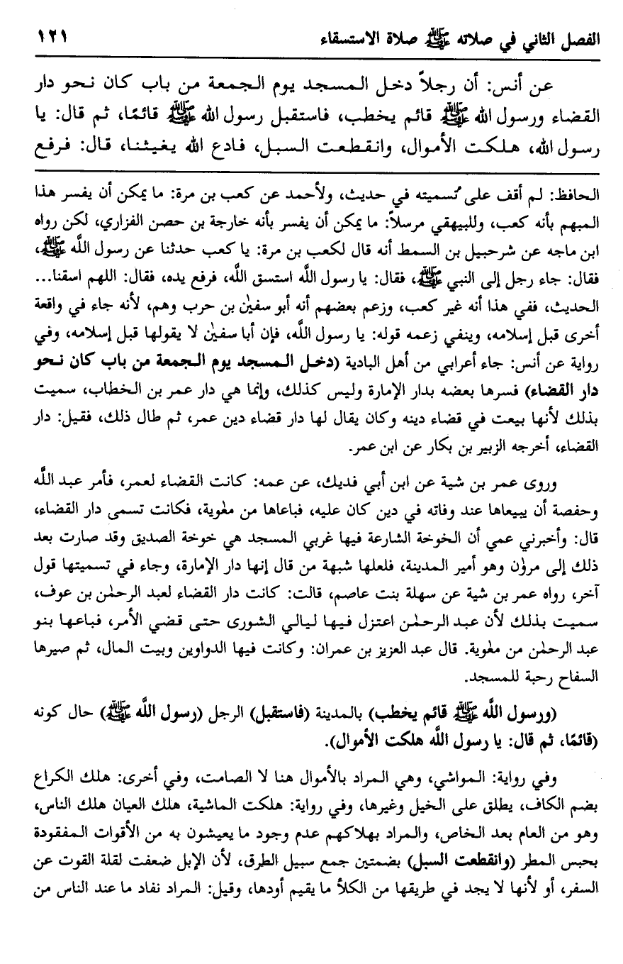 عن أنس: أن رجلا دخل المسجد يوم الجمعة من باب كان نحو دار القضاء ورسول الله -صلى الله عليه وسلم- قائم يخطب، فاستقبل رسول الله -صلى الله عليه وسلم- قائما، ثم قال: يا رسول الله، هلكت الأموال، وانقطعت السبل، فادع الله يغيثنا، قال: فرفع