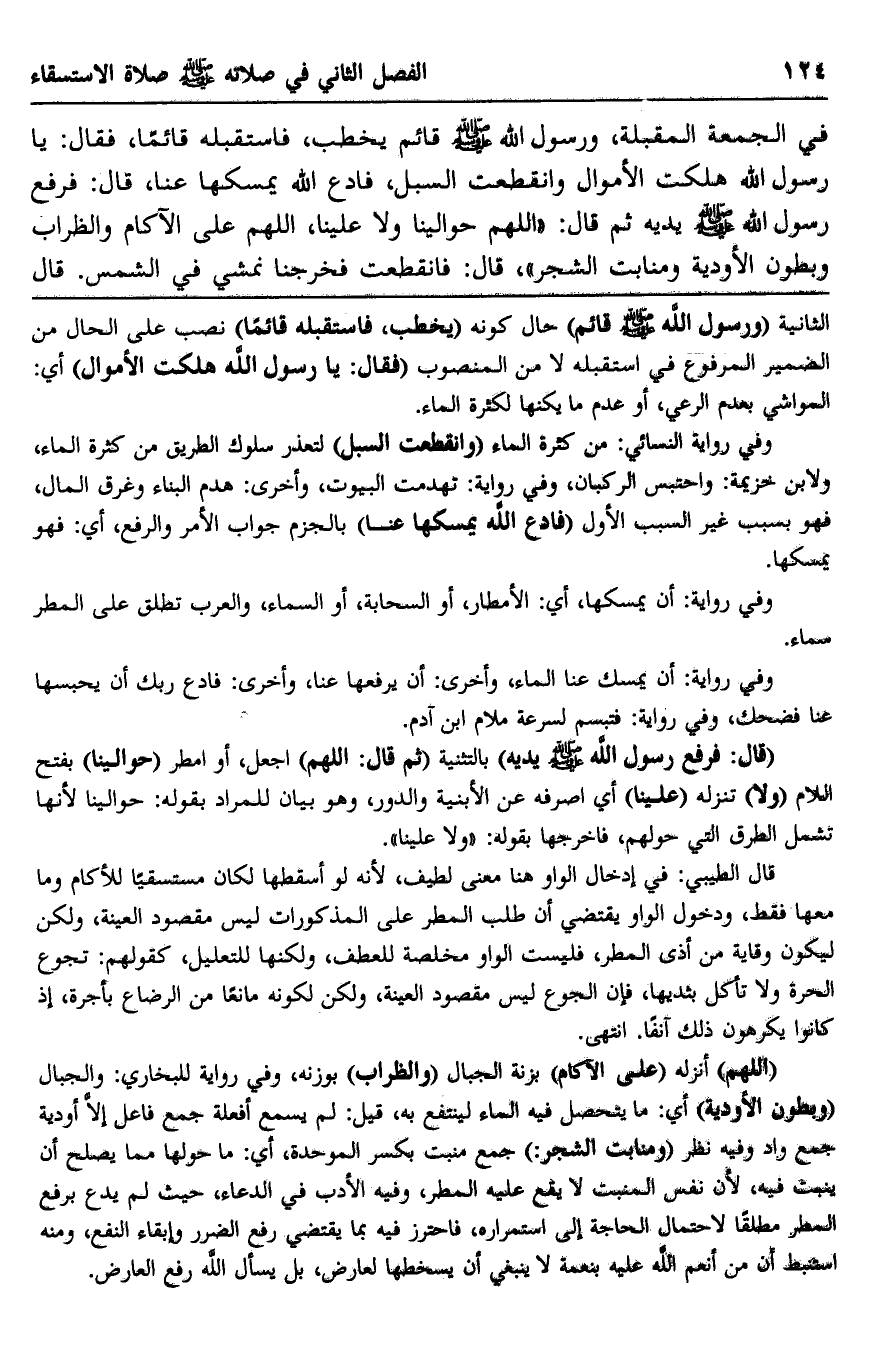 في الجمعة المقبلة، ورسول الله -صلى الله عليه وسلم- قائم يخطب، فاستقبله قائما، فقال: يا رسول الله هلكت الأموال وانقطعت السبل، فادع الله يمسكها عنا، قال: فرفع رسول الله -صلى الله عليه وسلم- يديه ثم قال: "اللهم حوالينا ولا علينا، اللهم على الآكام والظراب وبطون الأودية ومنابت الشجر"، قال: فانقطعت فخرجنا نمشي في الشمس. قال