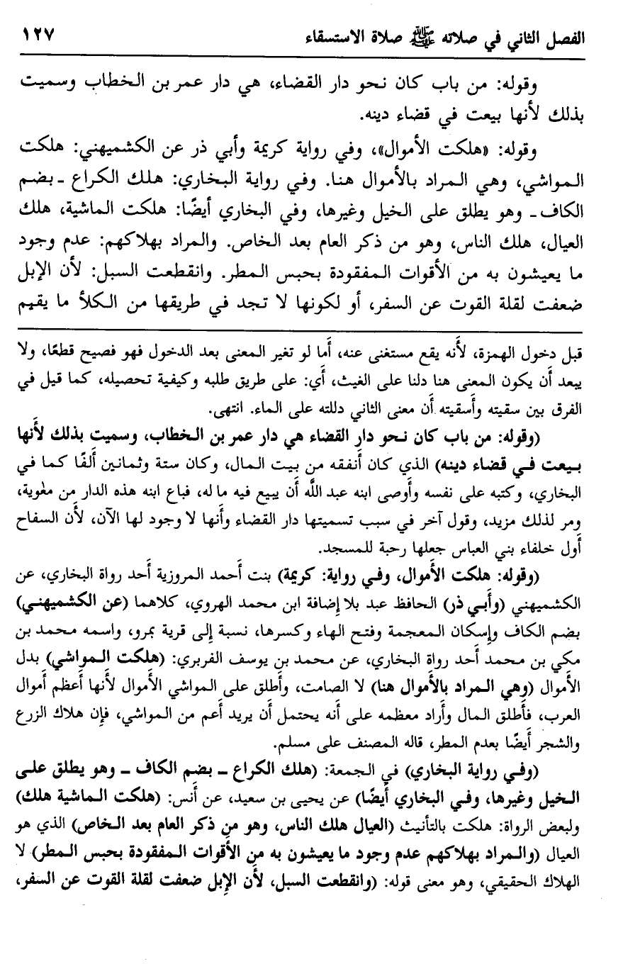 "وقوله: هلكت الأموال، وفي رواية: كريمة" بنت أحمد المروزية أحد رواة البخاري، عن الكشميهني "وأبي ذر" الحافظ عبد بلا إضافة ابن محمد الهروي، كلاهما "عن الكشميهني" بضم الكاف وإسكان المعجمة وفتح الهاء وكسرها، نسبة إلى قرية بمرو، واسمه محمد بن مكي بن محمد أحد رواة البخاري، عن محمد بن يوسف الفربري: "هلكت المواشي" بدل الأموال "وهي المراد بالأموال هنا" لا الصامت، وأطلق على المواشي الأموال؛ لأنها أعظم أموال العرب، فأطلق وأراد معظمه على أنه يحتمل أن يريد أعم من المواشي، فإن هلاك الزرع والشجر أيضا بعدم المطر، قاله المصنف على مسلم.