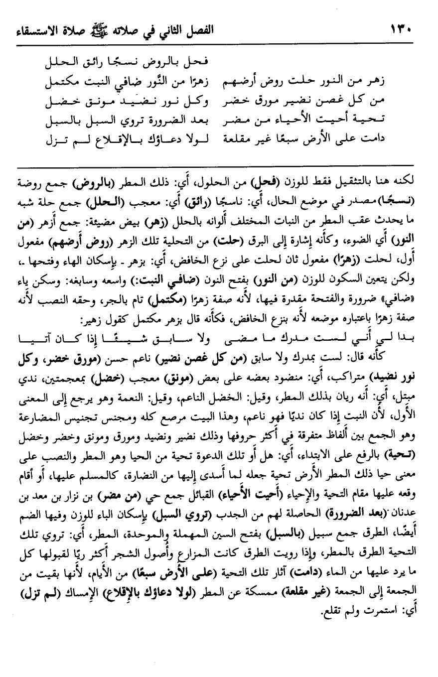 لكنه هنا بالتثقيل فقط للوزن "فحل" من الحلول، أي: ذلك المطر "بالروض" جمع روضة "نسجًا" مصدر في موضع الحال، أي: ناسجا "رائق" أي: معجب "الحلل" جمع حلة شبه ما يحدث عقب المطر من النبات المختلف ألوانه بالحلل "زهر" بيض مضيئة: جمع أزهر "من النور" أي الضوء، وكأنه إشارة إلى البرق "حلت" من التحلية تلك الزهر "روض أرضهم" مفعول أول، لحلت "زهرا" مفعول ثان لحلت على نزع الخافض، أي: بزهر -بإسكان الهاء وفتحها، ولكن يتعين السكون للوزن "من النور" بفتح النون "ضافي النبت:" واسعه وسابغه: وسكن ياء "ضافي" ضرورة والفتحة مقدرة فيها؛ لأنه صفة زهرا "مكتمل" تام بالجر، وحقه النصب؛ لأنه صفة زهرا باعتباره موضعه؛ لأن بنزع الخافض، فكأنه قال بزهر مكتمل كقول زهير: