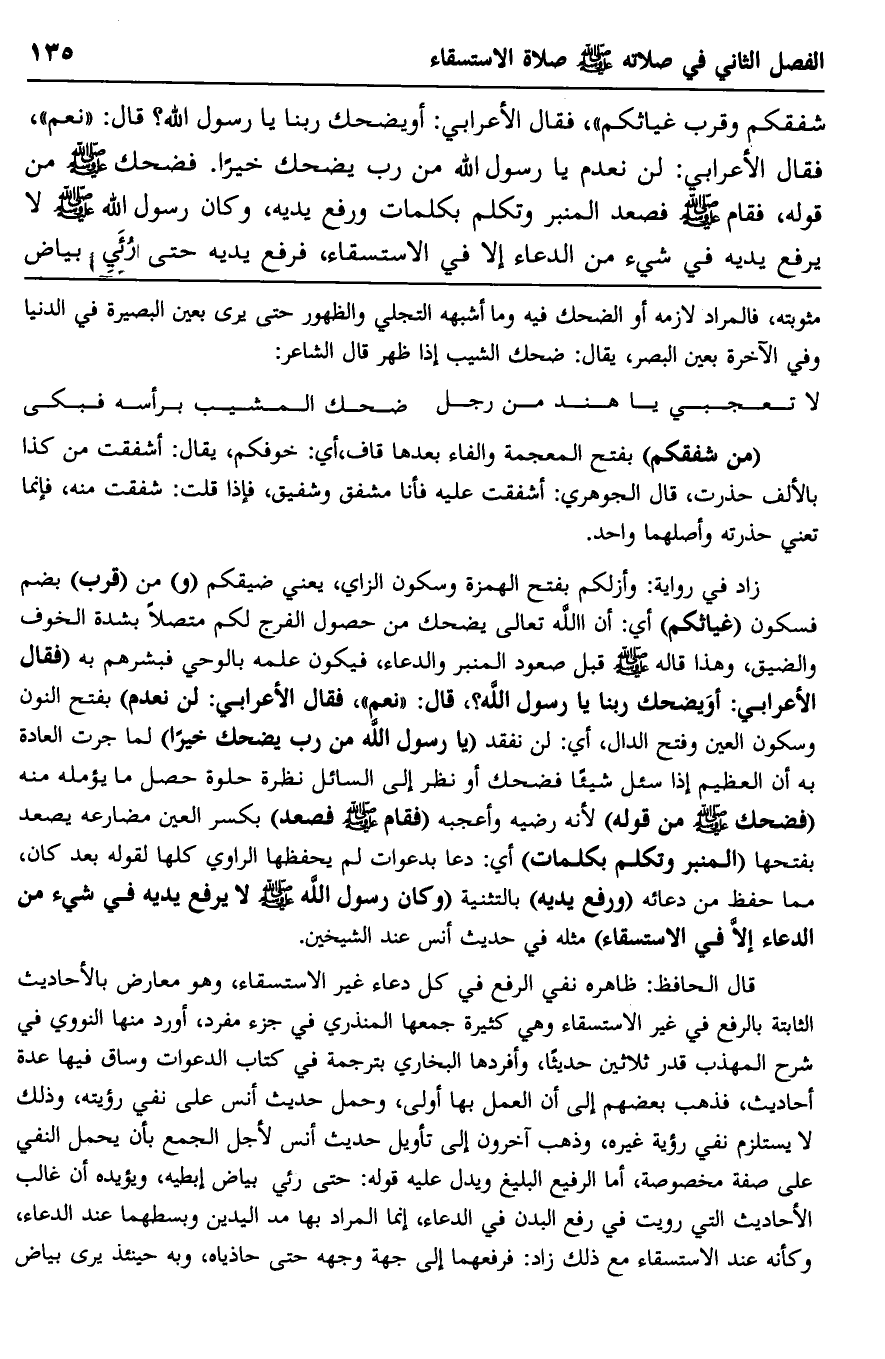 "شفقكم وقرب غياثكم"، فقال الأعرابي: أويضحك ربنا يا رسول الله؟ قال: "نعم"، فقال الأعرابي: لن نعدم يا رسول الله من رب يضحك خيرًا. فضحك -صلى الله عليه وسلم- من قوله، فقام -صلى الله عليه وسلم- فصعد المنبر وتكلم بكلمات ورفع يديه، وكان رسول الله -صلى الله عليه وسلم- لا يرفع يديه في شيء من الدعاء إلا في الاستسقاء، فرفع يديه حتى رئي بياض