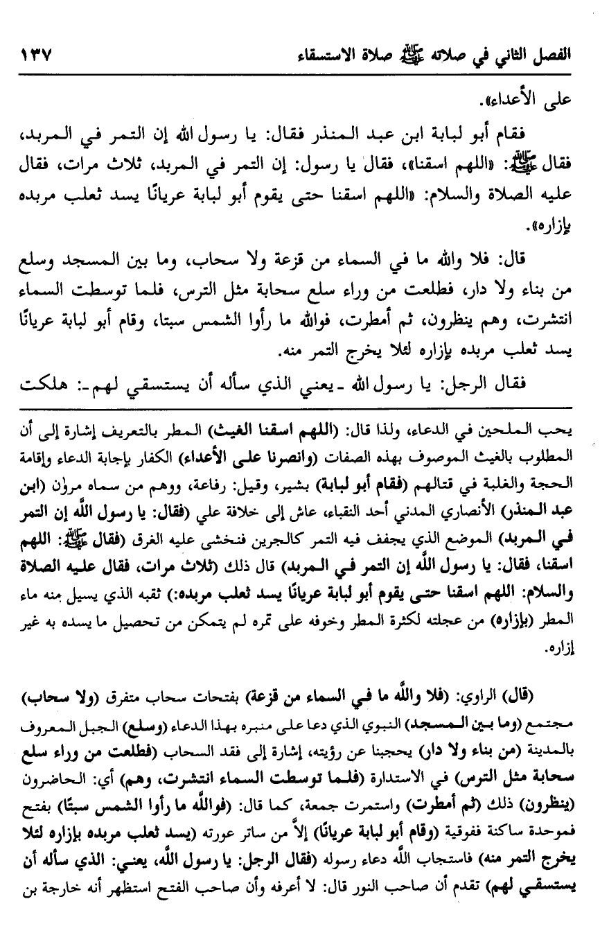 قال: فلا والله ما في السماء من قزعة ولا سحاب، وما بين المسجد وسلع من بناء ولا دار، فطلعت من وراء سلع سحابة مثل الترس، فلما توسطت السماء انتشرت، وهم ينظرون، ثم أمطرت، فوالله ما رأوا الشمس سبتا وقام أبو لبابة عريانا يسد ثعلب مربده بإزاره لئلا يخرج التمر منه.