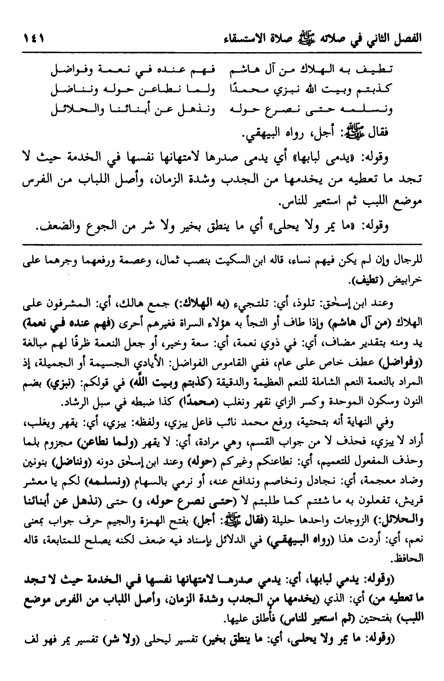 وعند ابن إسحاق: تلوذ، أي: تلتجئ "به الهلاك:" جمع هالك، أي: المشرفون على الهلاك "من آل هاشم" وإذا طاف أو التجأ به هؤلاء السراة لغيرهم أحرى "فهم عنده في نعمة" يد ومنه بتقدير مضاف، أي: في ذوي نعمة، أي: سعة وخير، أو جعل النعمة ظرفا لهم مبالغة "وفواضل" عطف خاص على عام، ففي القاموس الفواضل: الأيادي الجسيمة أو الجميلة، إذ المراد بالنعمة النعم الشاملة للنعم العظيمة والدقيقة "كذبتم وبيت الله" في قولكم: "نبزي" بضم النون وسكون الموحد وكسر الزاي نقهر وتغلب "محمدًا" كذا ضبطه في سبل الرشاد.