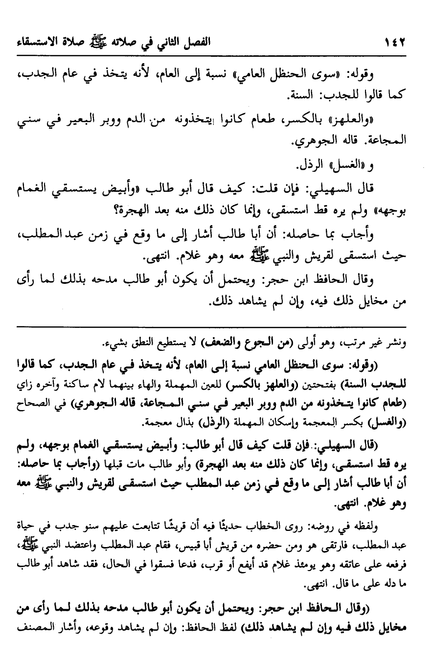 ولفظه في روضه: روى الخطاب حديثا فيه أن قريشا تتابعت عليهم سنو جدب في حياة عبد المطلب، فارتقى هو ومن حضره من قريش أبا قبيس، فقام عبد المطلب واعتضد النبي -صلى الله عليه وسلم، فرفعه على عاتقه وهو يومئذ غلام قد أيفع أو قرب، فدعا فسقوا في الحال، فقد شاهد أبو طالب ما دله على ما قاله. انتهى.