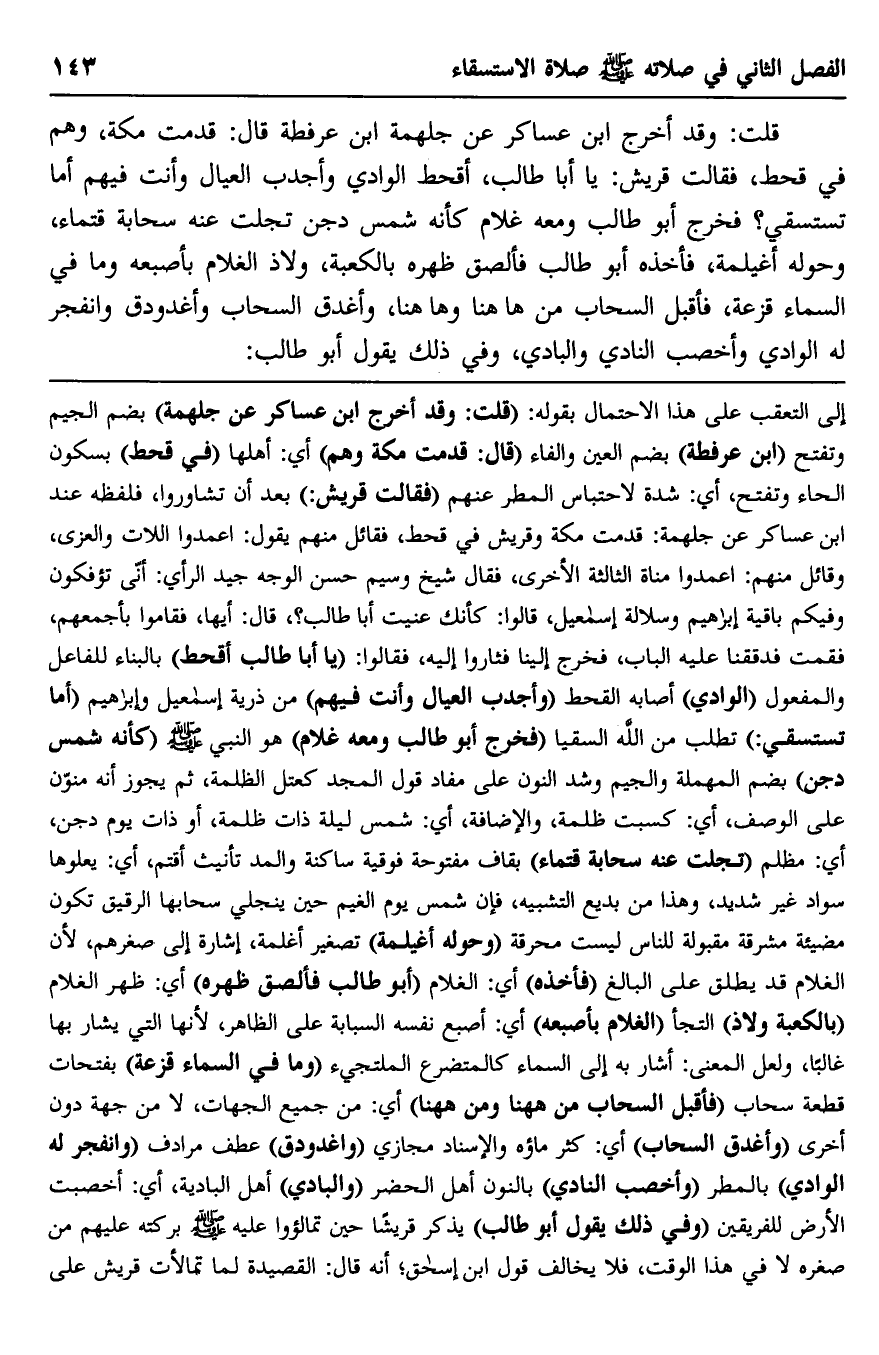 إلى التعقب على هذا الاحتمال بقوله: "قلت: وقد أخرج ابن عساكر عن جلهمة" بضم الجيم وتفتح "ابن عرفطة" بضم العين والفاء "قال: قدمت مكة وهم" أي: أهلها "في قحط" بسكون الحاء وتفتح، أي: شدة لاحتباس المطر عنهم "فقالت قريش:" بعد أن تشاوروا، فلفظه عند ابن عساكر عن جلهمة: قدمت مكة وقريش في قحط، فقائل منهم يقول: اعمدوا اللات والعزى، وقائل منهم: اعمدوا مناة الثالثة الأخرى، فقال شيخ وسيم حسن الوجه جيد الرأي: أنى تؤفكون وفيكم باقية إبراهيم وسلالة إسماعيل، قالوا: كأنك عنيت أبا طالب؟، قال: أيها، فقاموا بأجمعهم، فقمت قدققنا عليه الباب، فخرج إلينا فثاروا إليه، فقالوا: "يا أبا طالب أقحط" بالبناء للفاعل والمفعول "الوادي" أصابه القحط "وأجدب العيال وأنت فيهم" من ذرية إسماعيل وإبراهيم "أما تستسقي:" تطلب من الله السقيا "فخرج أبو طالب ومعه غلام" هو النبي -صلى الله عليه وسلم "كأنه شمس دجن" بضم المهملة الجيم وشد النون على مفاذ قول المجد كعتل الظلمة، ثم يجوز أنه منون على الوصف، أي: كسبت ظلمة، والإضافة، أي: شمس ليلة ذات ظلمة، أو ذات يوم دجن، أي: مظلم "تجلت عنه سحابة قتماء" بقاف مفتوحة فوقية ساكنة والمد تأنيث أقتم، أي: يعلوها سواد غير شديد، وهذا من بديع التشبيه، فإن شمس يوم الغيم حين ينجلي سحابها الرقيق تكون مضيئة مشرقة مقبولة للناس ليست محرقة "وحوله أغيلمة" تصغير أغلمة، إشارة إلى صغرهم؛ لأن الغلام قد يطلق على البالغ "فأخذه" أي: الغلام "أبو طالب فألصق ظهره" أي: ظهر الغلام "بالكعبة ولاذ" التجأ "الغلام بأصبعه" أي: أصبع نفسه السبابة على الظاهر؛ لأنها التي يشار بها غالبا، ولعل المعنى: أشار به إلى السماء كالمتضرع الملتجئ "وما في السماء قزعة" بفتحات قطعة سحاب "فأقبل السحاب من ههنا ومن ههنا" أي: من جميع الجهات، لا من جهة دون أخرى "وأغدق السحاب" أي: كثرة ماؤه والإسناد مجازي "واغدودق" عطف مرادف "وانفجر له الوادي" بالمطر "وأخصب النادي" بالنون أهل الحضر "والبادي" أهل البادية، أي: أخصبت الأرض للفريقين "وفي ذلك يقول أبو طالب" يذكر قريشا حين تمالؤوا عليه -صلى الله عليه وسلم- بركته عليهم من صغره لا في هذا الوقت، فلا يخالف قول ابن إسحاق؛ أنه قال: القصيدة لما تمالأت قريش على