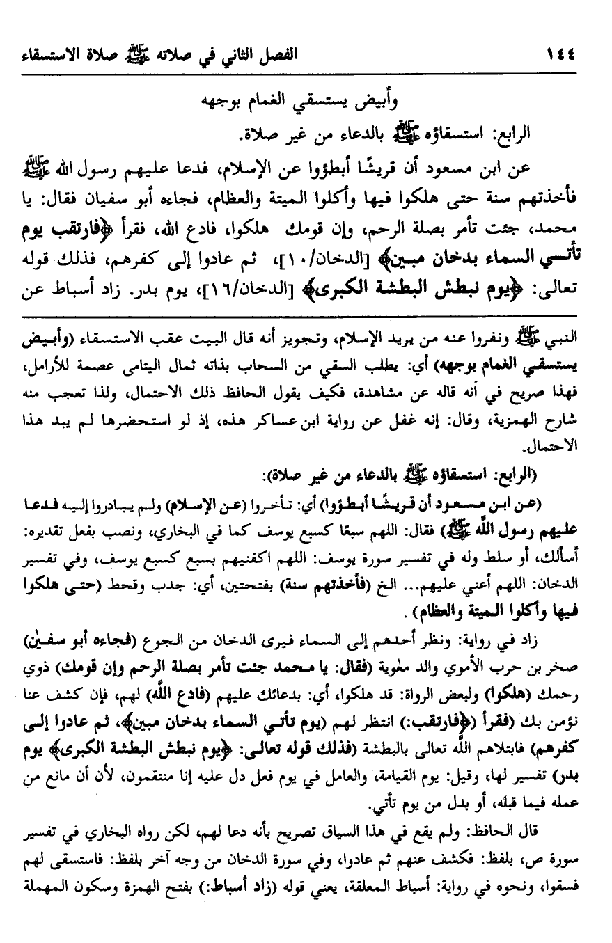 "عن ابن مسعود أن قريشا أبطؤوا" أي: تأخروا "عن الإسلام" ولم يبادروا إليه فدعا عليهم رسول الله -صلى اله عليه وسلم" فقال: اللهم سبعا كسبع يوسف كما في البخاري، ونصب بفعل تقديره: أسألك، أو سلط وله في تفسير سورة يوسف: "اللهم اكفنيهم بسبع كسبع يوسف،" وفي تفسير الدخان: "اللهم أعني عليهم".. إلخ "فأخذتهم سنة" بفتحتين، أي: جدب وقحط "حتى هلكوا فيها وأكلوا الميتة والعظام".