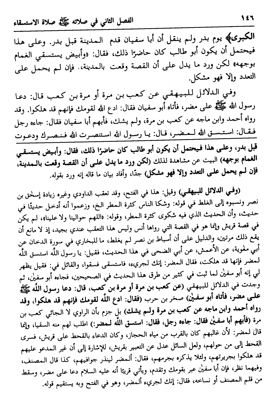 قبل بدر، وعلى هذا فيحتمل أن يكون أبو طالب كان حاضرا ذلك، فقال: وأبيض يستسقى الغمام بوجهه" البيت عن مشاهدة لذلك "لكن ورد ما يدل على أن القصة وقعت بالمدينة، فإن لم يحمل على التعدد وإلا فهو مشكل" جدا، وأفاد بيان ما قاله إنه ورد بقوله.
