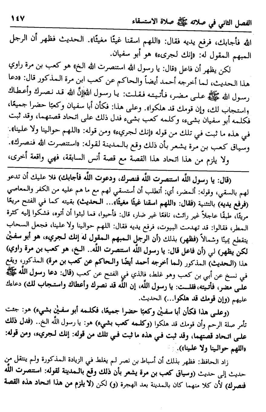 لكن يظهر أن فاعل "قال: يا رسول الله استنصرت الله.. إلخ" هو كعب بن مرة راوي هذا الحديث، لما أخرجه أحمد أيضا والحاكم عن كعب بن مرة المذكور قال: "دعا رسول الله -صلى الله عليه وسلم- على مضر، فأتيته فقلت: يا رسول الله إن الله قد نصرك وأعطاك واستجاب لك، وإن قومك قد هلكوا". وعلى هذا: فكأن أبا سفيان وكعبا حضرا جميعا، فكلمه أبو سفيان بشيء، وكلمة كعب بشيء فدل ذلك على اتحاد قصتهما، وقد ثبت في هذه ما ثبت في تلك من قوله: "إنك لجريء" ومن قوله: "اللهم حوالينا ولا علينا". وسياق كعب بن مرة يشعر بأن ذلك وقع بالمدينة لقوله: "استنصرت الله فنصرك".