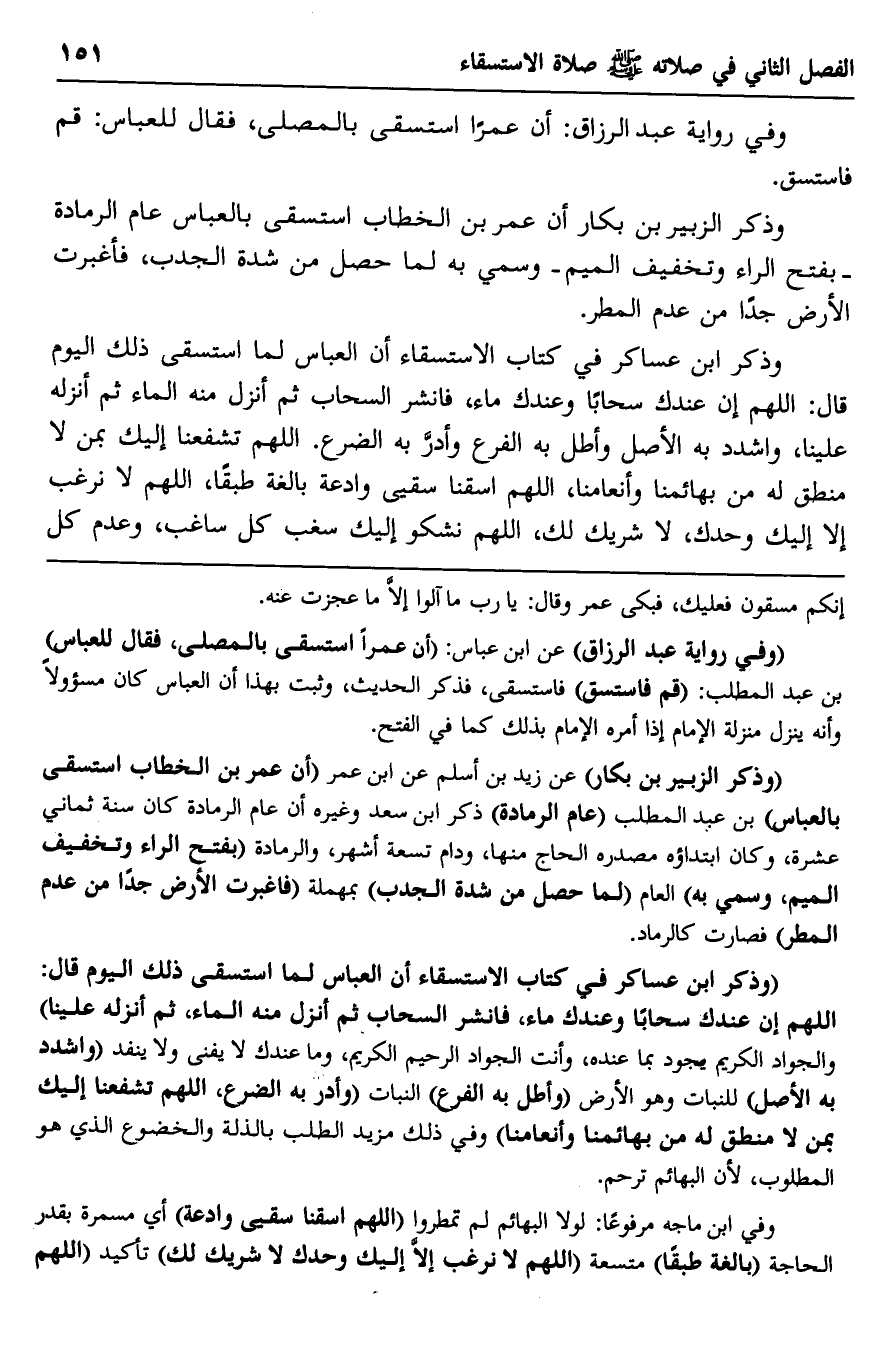 وذكر ابن عساكر في كتاب الاستسقاء أن العباس لما استسقى ذلك اليوم قال: اللهم إن عندك سحابا وعندك ماء، فانشر السحاب ثم أنزل منه الماء ثم أنزله علينا، واشدد به الأصل وأطل به الفرع وأدر به الضرع. اللهم تشفعنا إليك بمن لا منطق له من بهائمنا وأنعامنا، الله اسقنا سقيى وادعة بالغة طبقا، اللهم لا نرغب إلا إليك وحدك، لا شريك لك، اللهم نشكو إليك سغب كل ساغب، وعدم كل