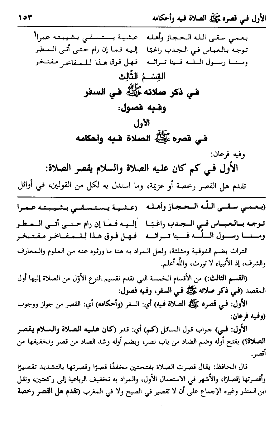 "القسم الثالث": من الأقسام الخمسة التي تقدم تقسيم النوع الأول من الصلاة إليها أول المقصد "في ذكر صلاته -صلى الله عليه وسلم- في السفر، وفيه فصول: