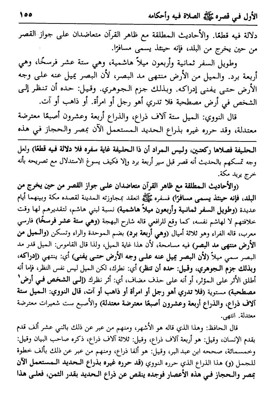 "والأحاديث المطلقة مع ظاهر القرآن متعاضدان على جواز القصر من حين يخرج من البلد، فإنه حينئذ يسمى مسافرا" فسفره -صلى الله عليه وسلم- انعقد بمجاوزته المدينة لقصده مكة وبينهما أيام عديدة "وطويل السفر ثمانية وأربعون ميلا هاشمية" نسبة لبني هاشم، لتقديرهم لها وقت خلافتهم لا لهاشم نفسه، كما وقع للرافعي قاله شارح البهجة "وهي ستة عشر فرسخا" فارسي معرب، قاله الفراء وهو ثلاثة أميال "وهي أربعة برد" بضم الموحدة والراء وتسكن "والميل من الأرض منتهى مد البصر" فيه مسامحة؛ لأن هذا غاية الميل، ولذا قال القاموس: الميل قدر مد البصر سمي ميلا؛ "لأن البصر يميل عنه على وجه الأرض حتى يفنى" أي ينتهي "إدراكه، وبذلك جزم الجوهري، وقيل: حده أن تنظر" أي: نطرك، لكن الميل ليس نفس النظر، فإما أنه أطلق الأثر على المؤثر، أو أنه على حذف مضاف، أي: أثر نظرك "إلى الشخص في أرض مصطحبة" مستوية "فلا تدري أهو رجل أو امرأة أو ذاهب أو آت، قال النووي: الميل ستة آلاف ذراع، والذراع أربعة وشرون أصبعا معترضة معتدلة" والأصبع ست شعيرات معترضة معتدلة. انتهى.