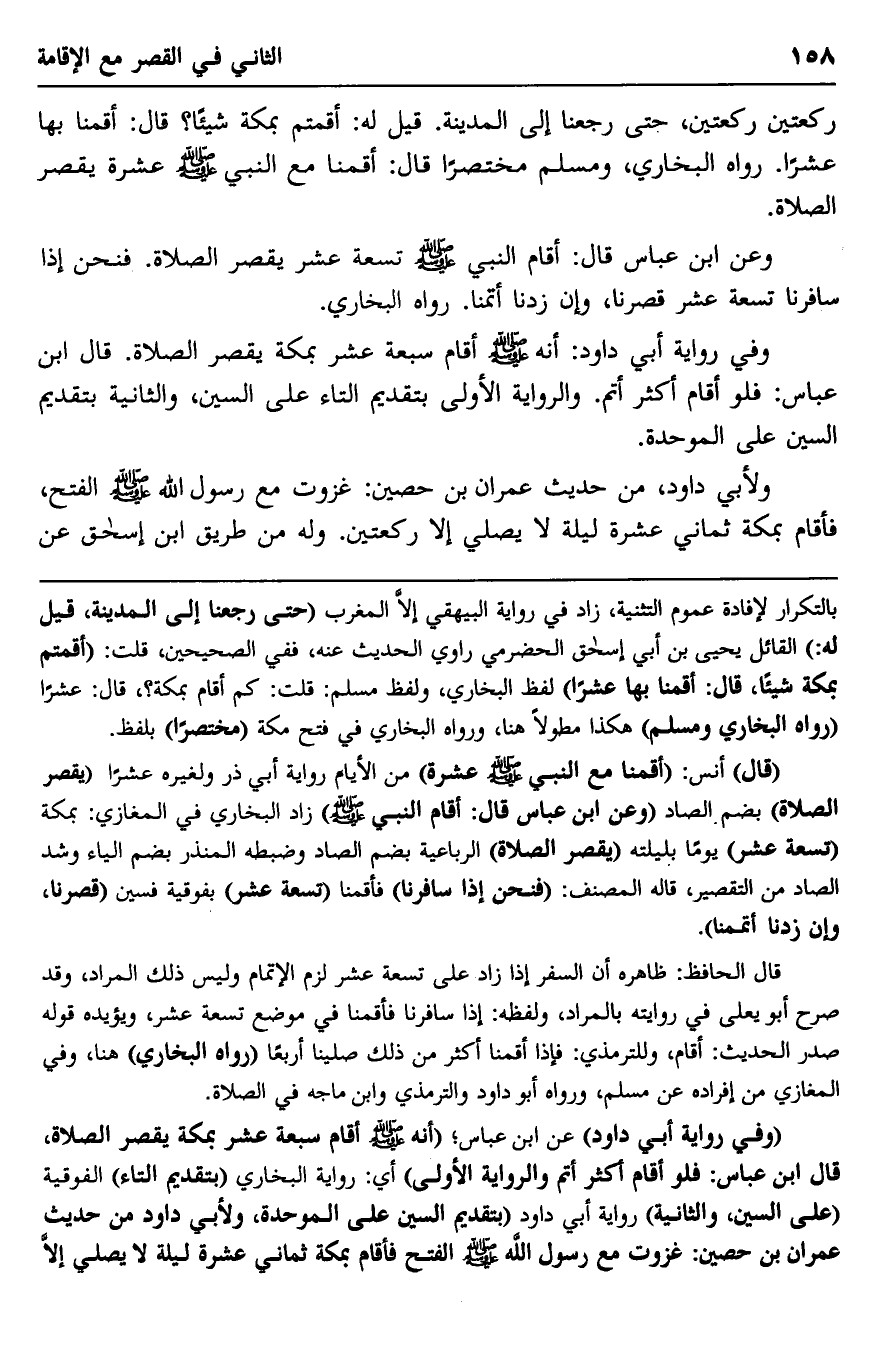 ولأبي داود، من حديث عمران بن حصين: غزوت مع رسول الله -صلى الله عليه وسلم- الفتح، فأقام بمكة ثماني عشرة ليلة لا يصلي إلا ركعتين. وله طريق ابن إسحاق عن