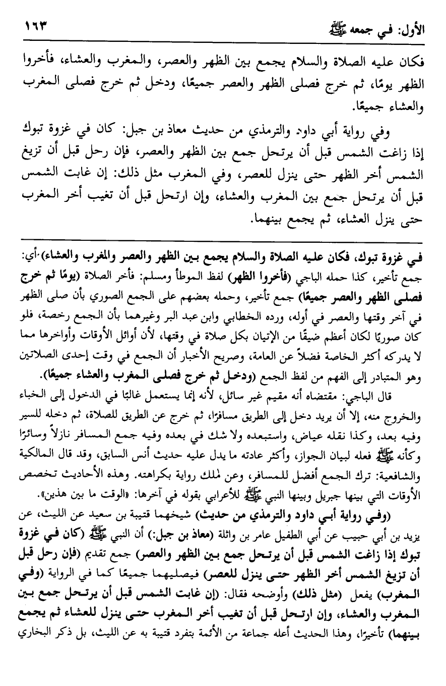 وفي رواية أبي داود والترمذي من حديث معاذ بن جبل: كان في غزوة تبوك إذا زاغت الشمس قبل أن يرتحل جمع بين الظهر والعصر، فإن رحل قبل أن تزيغ الشمس أخر الظهر حتى ينزل للعصر، وفي المغرب مثل ذلك: إن غابت الشمس قبل أن يرتحل جمع بين المغرب والعشاء، وإن ارتحل قبل أن تغيب أخر المغرب حتى ينزل العشاء، ثم يجمع بينهما.