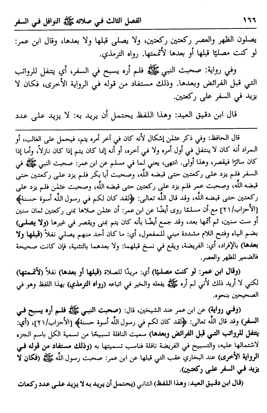 وفي رواية: صحبت النبي -صلى الله عليه وسلم- فلم أره يسبح في السفر، أي يتنفل للرواتب التي قبل الفرائض وبعدها. وذلك مستفاد من قوله في الرواية الأخرى، فكان لا يزيد في السفر على ركعتين.