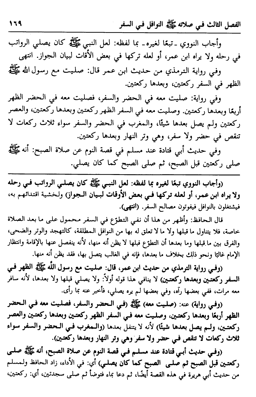 قال الحافظ: وأظهر من هذا أن نفي التطوع في السفر محمول على ما بعد الصلاة خاصة، فلا يتناول ما قبلها ولا ما لا تعلق له بها من النوافل المطلقة، كالتهجد والوتر والضحى، والفرق بين ما قبلها وما بعدها أن التطوع قبلها لا يظن أنه منها؛ لأنه ينفصل عنها بالإقامة وانتظار الإمام غالبا، ونحو ذلك بخلاف ما بعدها، فإن في الغالب يتصل بها، فقد يظن أنه منها.