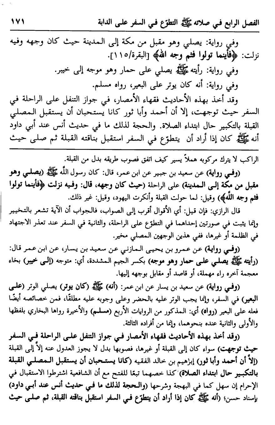 وقد أخذ بهذه الأحاديث فقهاء الأمصار، في جواز التنفل على الراحلة في السفر حيث توجهت، إلا أن أحمد وأبا ثور كانا يستحبان أن يستقبل المصلي القبلة بالتكبير حال ابتداء الصلاة. والحجة لذلك ما في حديث أنس عند أبي داود أنه -صلى الله عليه وسلم- كان إذا أراد أن يتطوع في السفر استقبل بناقته القبلة، ثم صلى حيث
