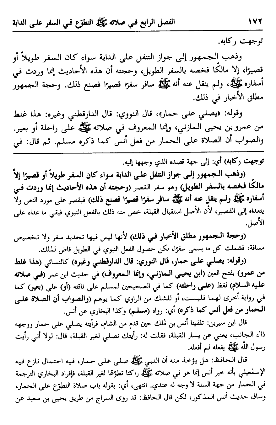 "وذهب الجمهور إلى جواز التنفل على الدابة سواء كان السفر طويلا أو قصيرا إلا مالكا فخصه بالسفر الطويل" وهو سفر القصر "وحجته أن هذه الأحاديث إنما وردت في أسفاره -صلى الله عليه وسلم- ولم ينقل عنه أنه -صلى الله عليه وسلم- سافر سفرا قصيرا فصنع ذلك" فيقصر على مورد النص ولا يتعداه إلى القصير؛ لأن الأصل استقبال القبلة، خص منه ذلك بالفعل النبوي فبقي ما عداه على الأصل.
