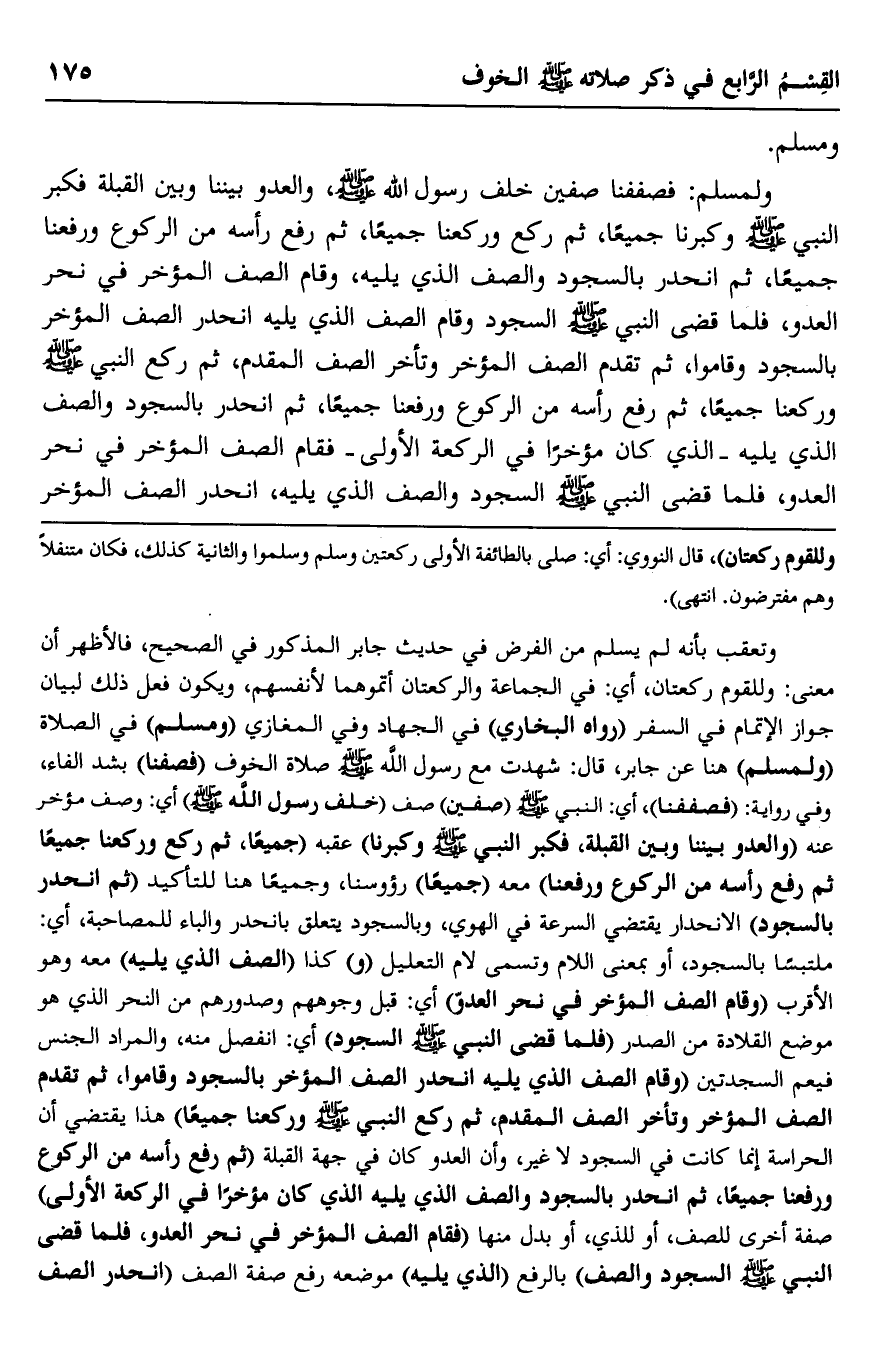 ولمسلم: فصففنا صفين خلف رسول الله -صلى الله عليه وسلم، والعدو بيننا وبين القبلة فكبر النبي -صلى الله عليه وسلم- وكبرنا جميعا، ثم ركع وركعنا جميعا، ثم رفع رأسه من الركوع ورفعنا جميعا، ثم انحدر بالسجود والصف الذي يليه، وقام الصف المؤخر في نحر العدو فلما قضى النبي -صلى الله عليه وسلم- السجود وقام الصف الذي يليه انحدر الصف المؤخر بالسجود وقاموا، ثم تقدم الصف المؤخر وتأخر الصف المقدم، ثم ركع النبي -صلى الله عليه وسلم- وركعنا جميعا، ثم رفع رأسه من الركوع ورفعنا جميعا، ثم انحدر بالسجود والصف الذي يليه -الذي كان مؤخرا في الركعة الأولى -فقام الصف المؤخر في نحر العدو، فلما قضى النبي -صلى الله عليه وسلم- السجود والصف الذي يليه، انحدر الصف المؤخر