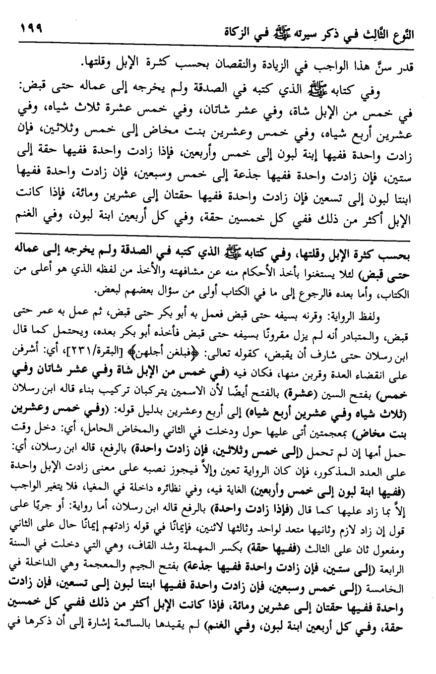 بحسب كثرة الإبل وقلتها، وفي كتابه -صلى الله عليه وسلم- الذي كتبه في الصدقة ولم يخرجه إلى عماله حتى قبض" لئلا يستغنوا بأخذ الأحكام منه عن مشافهته والأخذ من لفظه الذي هو أعلى من الكتاب، وأما بعده فالرجوع إلى ما في الكتاب أولى من سؤال بعضهم لبعض.