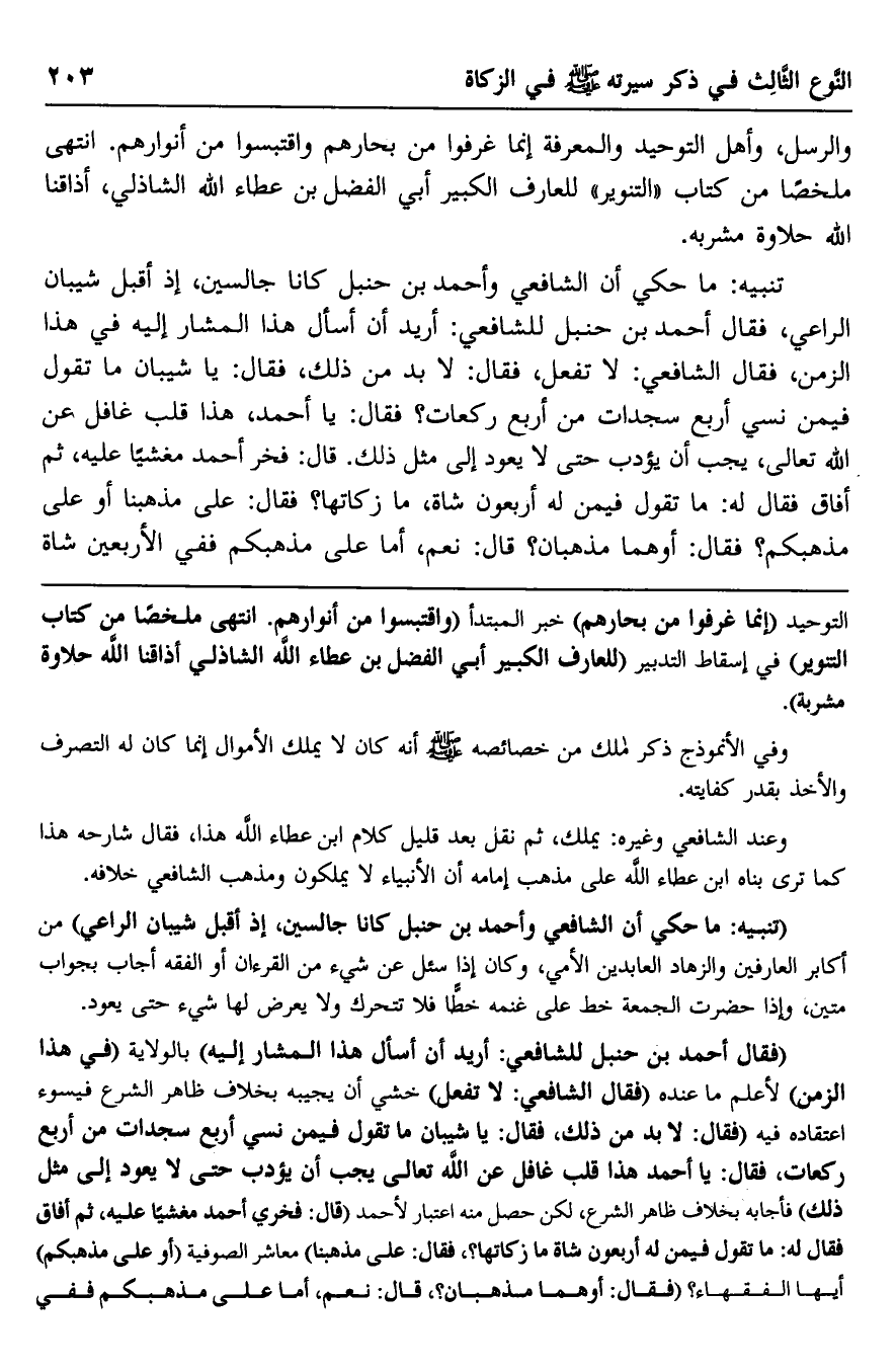 تنبيه: ما حكي أن الشافعي وأحمد بن حنبل كانا جالسين، إذ أقبل شيبان الراعي، فقال أحمد بن حنبل للشافعي: أريد أن أسأل هذا المشار إليه في هذا الزمن، فقال الشافعي: لا تفعل، فقال: لا بد من ذلك، فقال: يا شيبان ما تقول فيمن نسي أربع سجدات من أربع ركعات؟ فقال: يا أحمد، هذا قلب غافل عن الله تعالى، يجب أن يؤدب حتى لا يعود إلى مثل ذلك. قال: فخر أحمد مغشيا عليه، ثم أفاق فقال له: ما تقول فيمن له أربعون شاة، ما زكاتها؟ فقال: على مذهبنا أو على مذهبكم؟ فقال: أوهما مذهبان؟ قال: نعم، أما على مذهبكم ففي الأربعين شاة