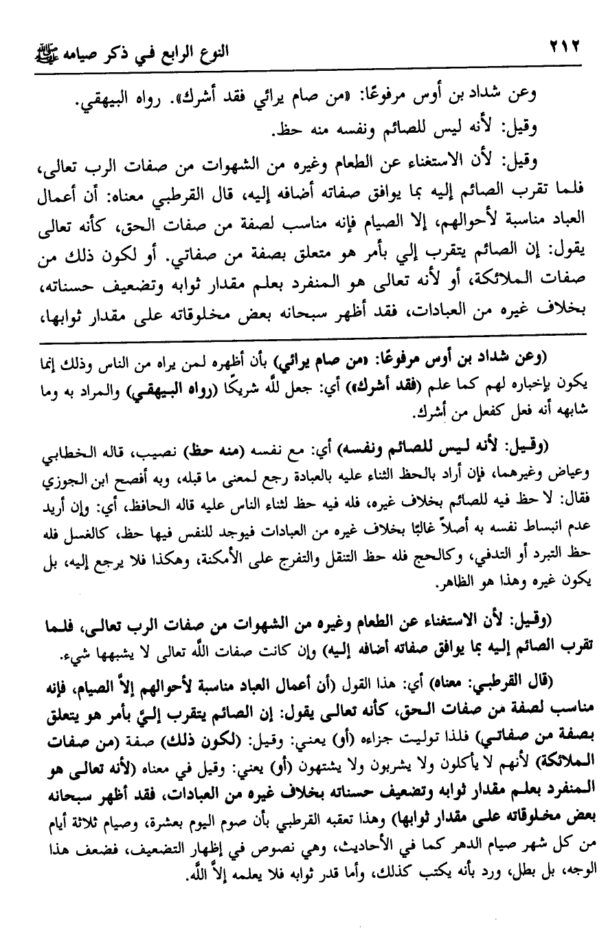 "وعن شداد بن أوس مرفوعًا: "من صام يرائي" بأن أظهره لمن يراه من الناس وذلك إنما يكون بإخباره لهم كما علم "فقد أشرك" أي: جعل لله شريكا "رواه البيهقي" والمراد به وما شابهه أنه فعل كفعل من أشرك.