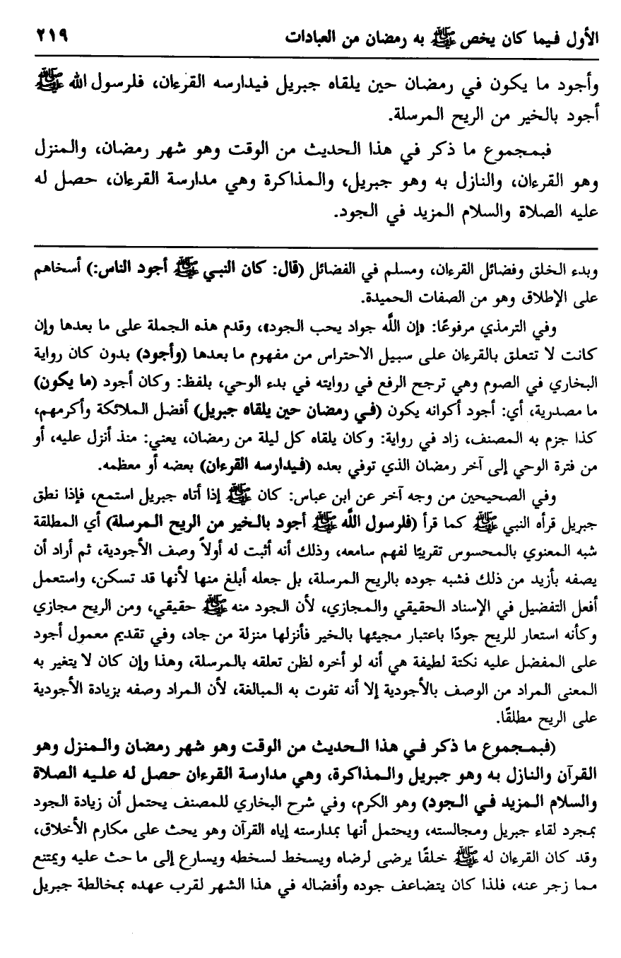"فبمجموع ما ذكر في هذا الحديث من الوقت، وهو شهر رمضان والمنزل وهو القرآن والنازل به وهو جيريل والمذاكرة، وهي مدارسة القرآن حصل له عليه الصلاة والسلام المزيد في الجود" وهو الكرم، وفي شرح البخاري للمصنف يحتمل أن زيادة الجود بمجرد لقاء جبريل ومجالسته، ويحتمل أنها بمدارسته إياه القرآن وهو يحث على مكارم الأخلاق، وقد كان القرآن له -صلى الله عليه وسلم- خلقا يرضى لرضاه ويسخط لسخطه، ويسارع إلى ما حث عليه ويمتنع مما زجر عنه، فلذا كان يتضاعف جوده وأفضاله في هذا الشهر لقرب عهده بمخالطة جبريل