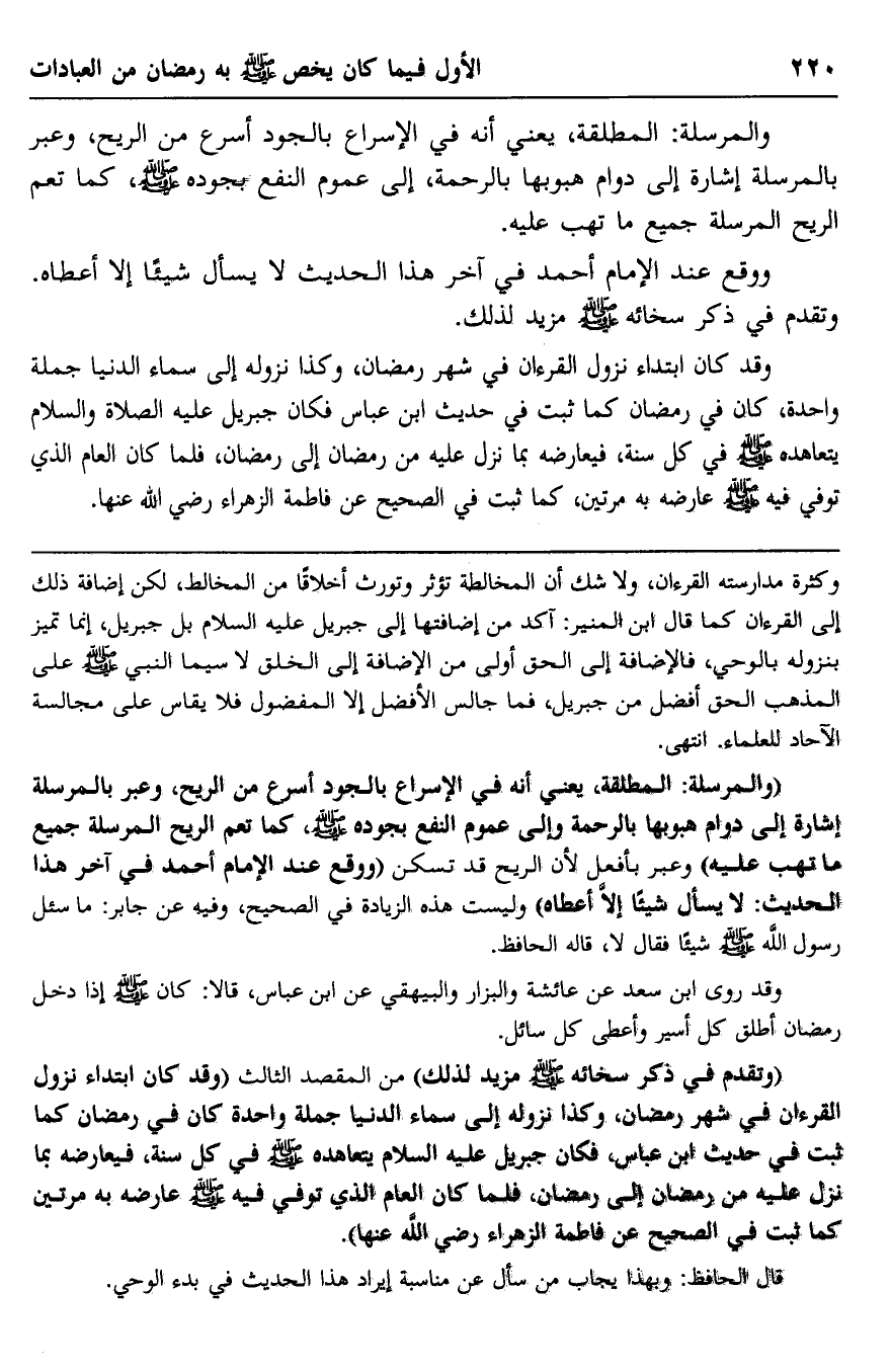 "والمرسلة: المطلقة، يعني أنه في الإسراع بالجود أسرع من الريح، وعبر بالمرسلة إشارة إلى دوام هبوبها بالرحمة وإلى عموم النفع بجوده -صلى الله عليه وسلم، كما تعم الريح المرسلة جميع ما تهب عليه" وعبر بأفعال؛ لأن الريح قد تسكن "ووقع عند الإمام أحمد في آخر هذا الحديث: "لا يسأل شيئا إلا أعطاه" وليست هذه الزيادة في الصحيح، وفيه عن جابر: ما سئل رسول الله -صلى الله عليه وسلم- شيئا فقال: لا، قاله الحافظ.
