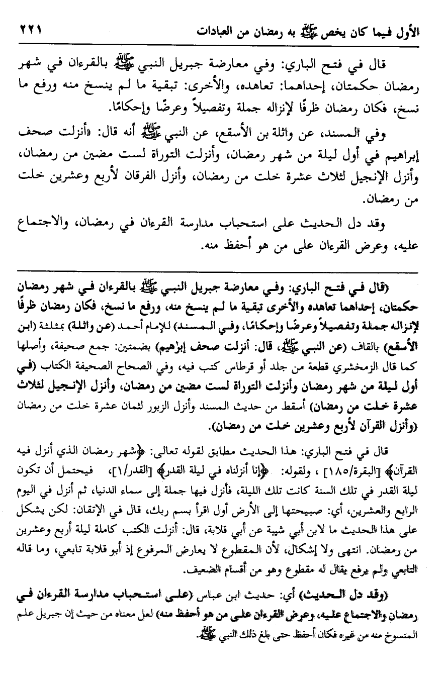 "قال في فتح الباري: وفي معارضة جبريل النبي -صلى الله عليه وسلم- بالقرآن في شهر رمضان حكمتان، إحداهما تعاهده والأخرى تبقية ما لم ينسخ منه، ورفع ما نسخ، لكان رمضان ظرفا لإنزاله جملة وتفصيلا وعرضًا وإحكاما، وفي المسند" للإمام أحمد "عن واثلة" بمثلثة "ابن الأسقع" بالقاف "عن النبي -صلى الله عليه وسلم، قال: "أنزلت صحف إبراهيم" بضمتين: جمع صحيفة، وأصلها كما قال الزمخشري قطعة من جلد أو قرطاس كتب فيه، وفي الصحاح الصحيفة الكتاب "في أول ليلة من شهر رمضان وأنزلت التوراة لست مضين من رمضان، وأنزل الإنجيل لثلاث عشرة خلت من رمضان" أسقط من حديث المسند وأنزل الزبور لثمان عشرة خلت من رمضان "وأنزل القرآن لأربع وعشرين خلت من رمضان".